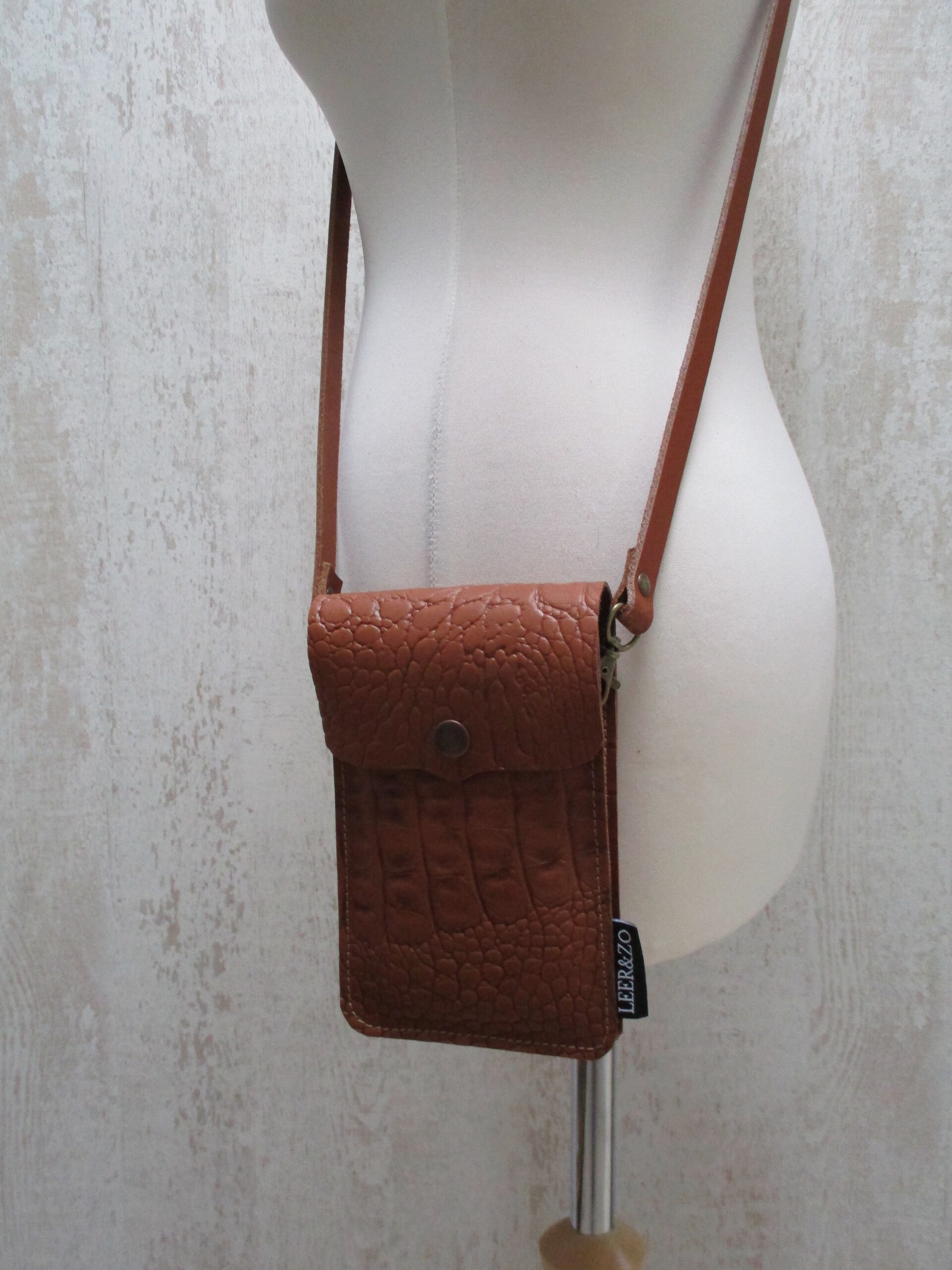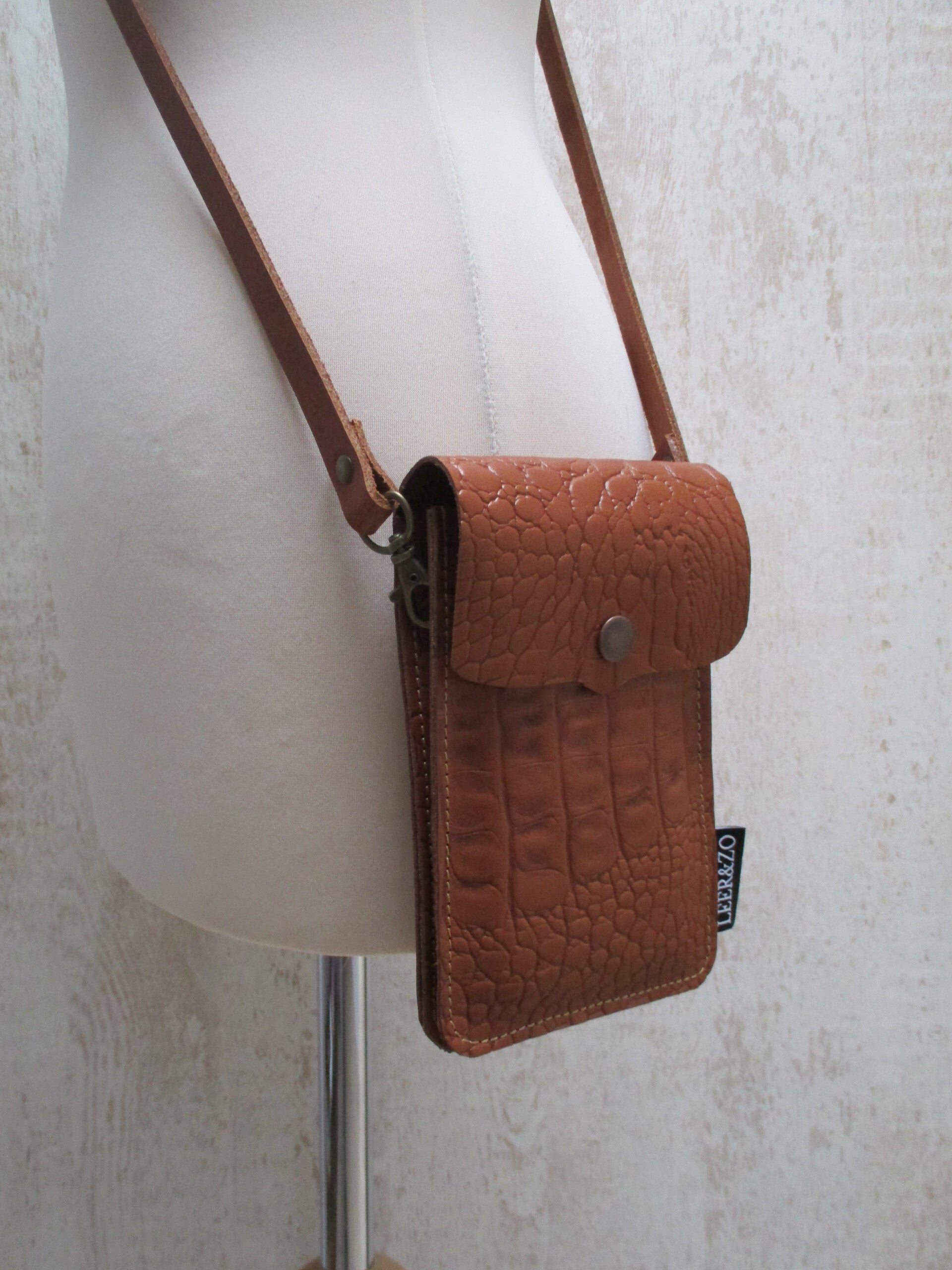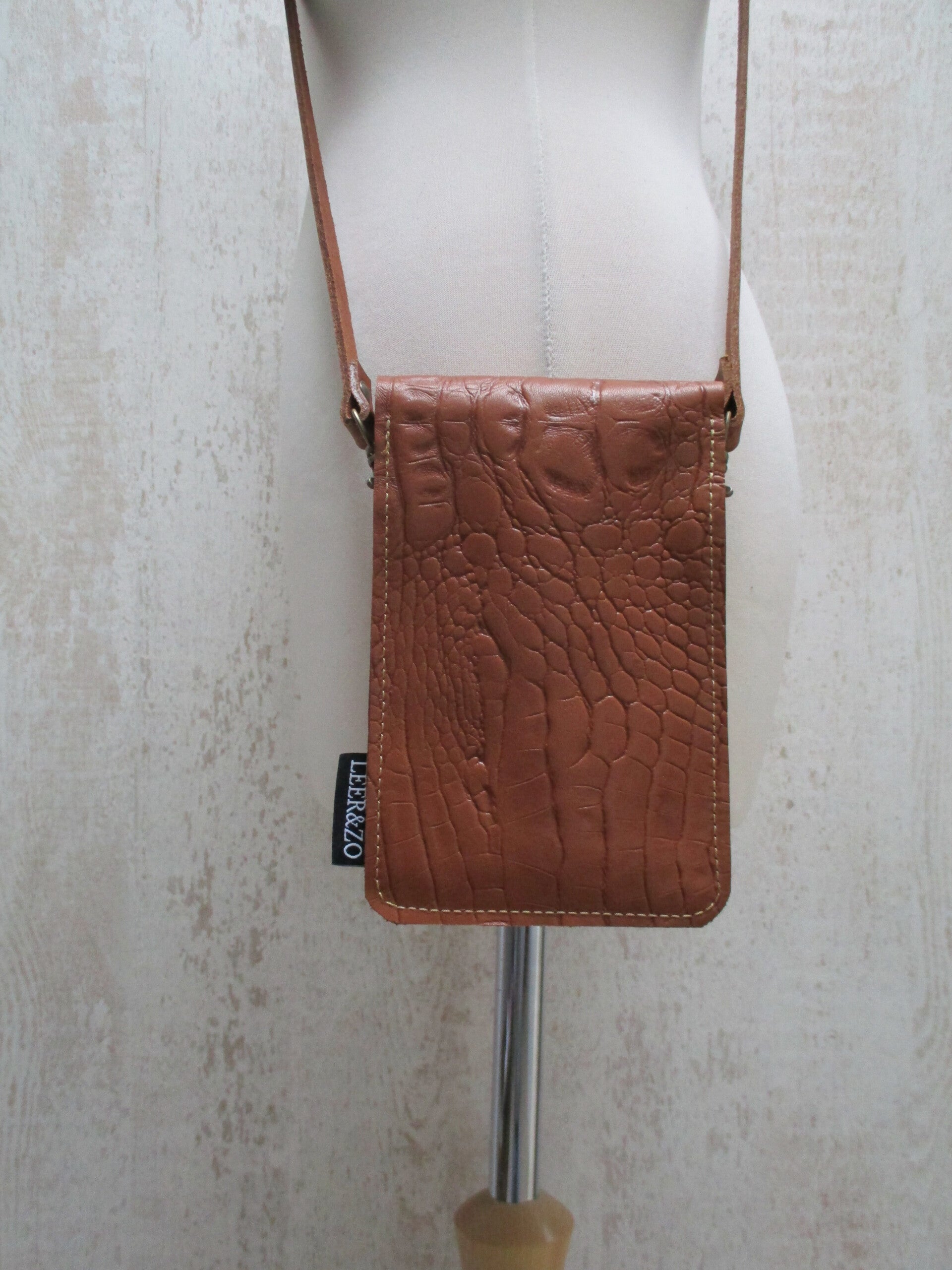 Schitterend handgemaakte schoudertasje gemaakt van cognac leer met croco print. Het handige van dit tasjes is dat het uit 2 aparte vakken bestaat. En ruim genoeg voor je mobiel, geld en sleutels in mee te nemen. Erg handig voor de aankomende zomerfestivals, vakantie's, terrasjes of op de fiets. Sluit met een mooie drukknoop.