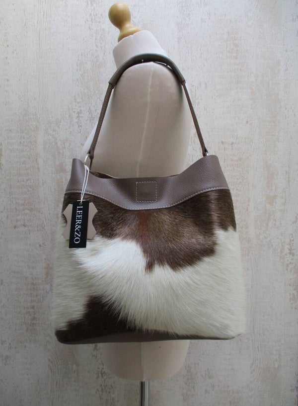 Schitterende taupe leren schoudertas gemaakt met prachtig taupe/wit koeienhuid. De achterzijde is van mooi taupe leer. De tas is zowel aan de hand als over de schouder te dragen. En sluit doormiddel van een magneetsluiting aan de bovenzijde. De afmetingen zijn H28 x B30 x D16cm.