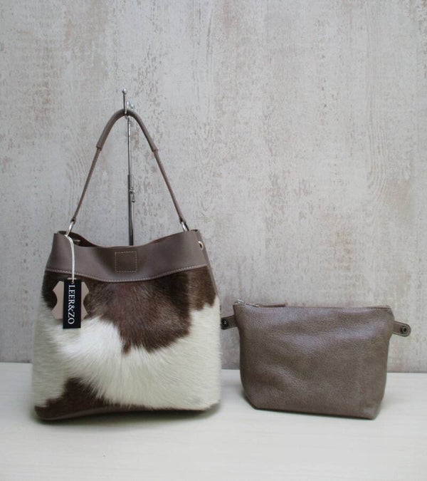 Taupe leren buideltas met taupe/wit koeienhuid
