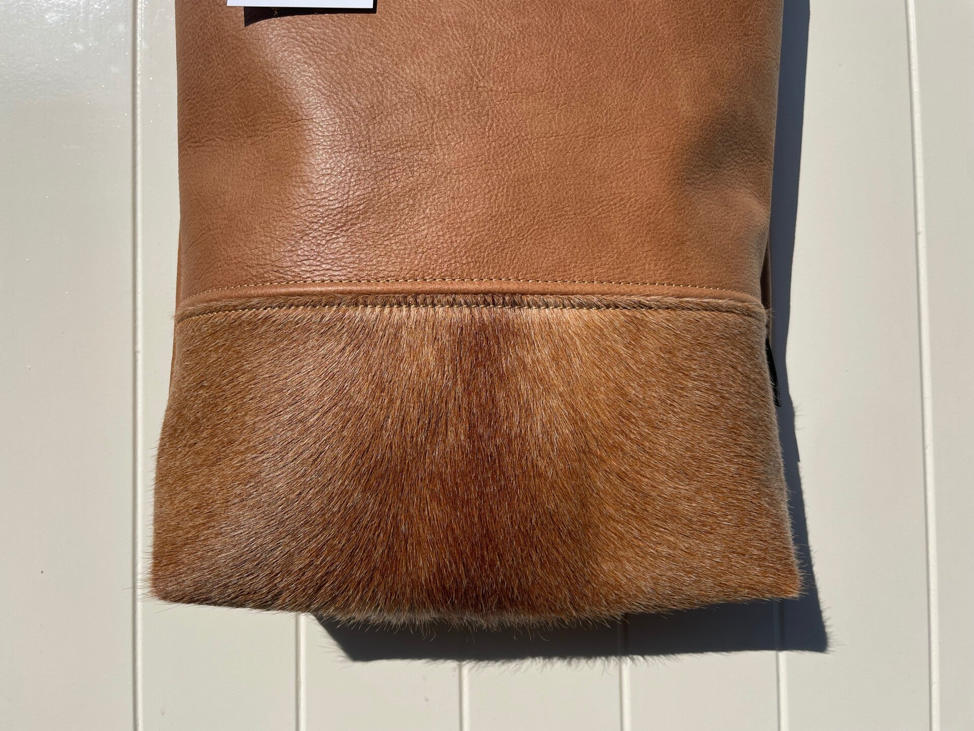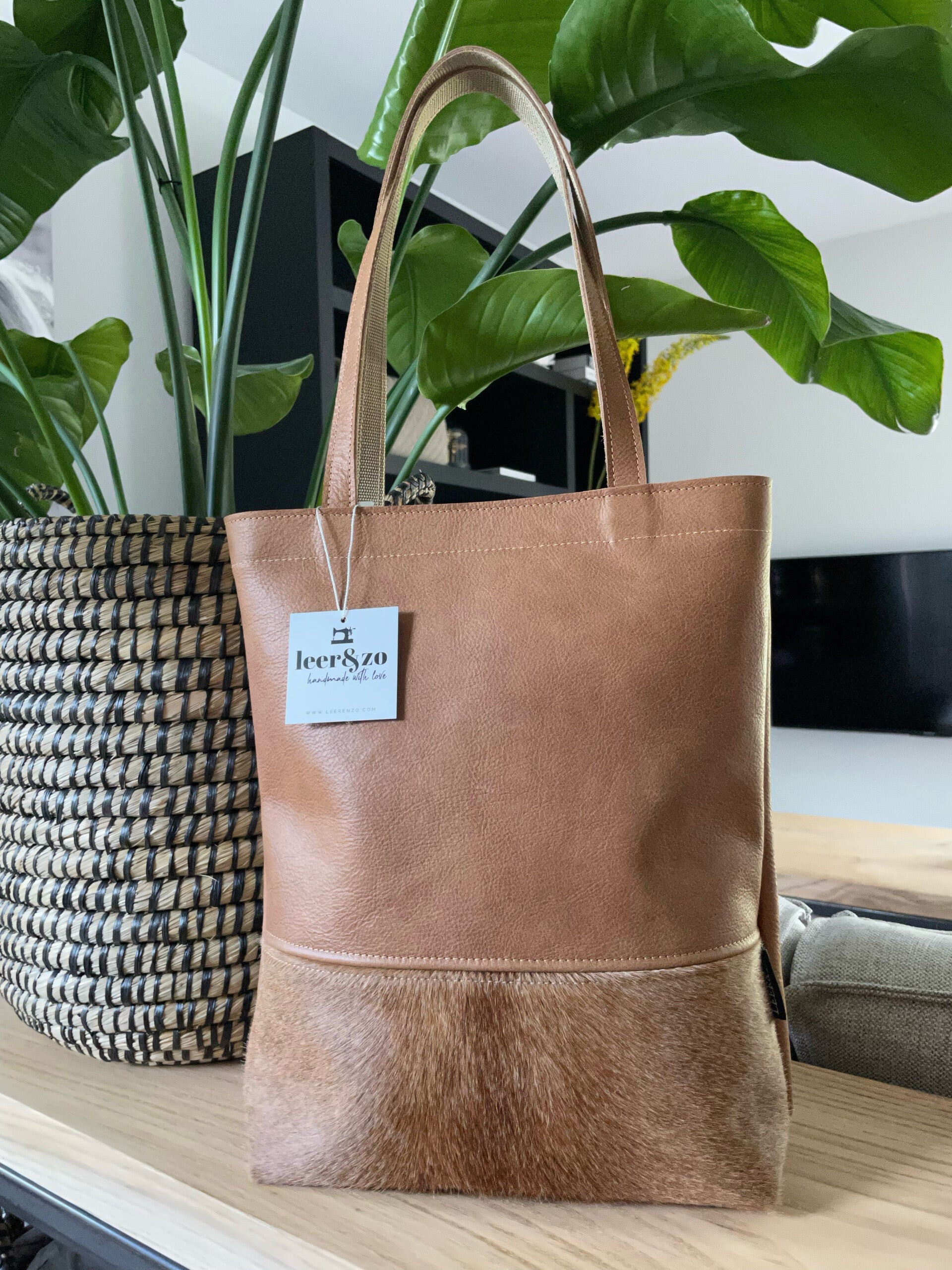 Prachtige cognac leren Tote Bag shopper met aan de onderzijde uniek cognac koeienhuid. Deze geweldige tas is multifunctioneel en heerlijk ruim. Te gebruiken als laptoptas/studietas of gewoon als shopper. Er is ruimte genoeg voor laptop, schrijfmap, agenda en andere spullen.