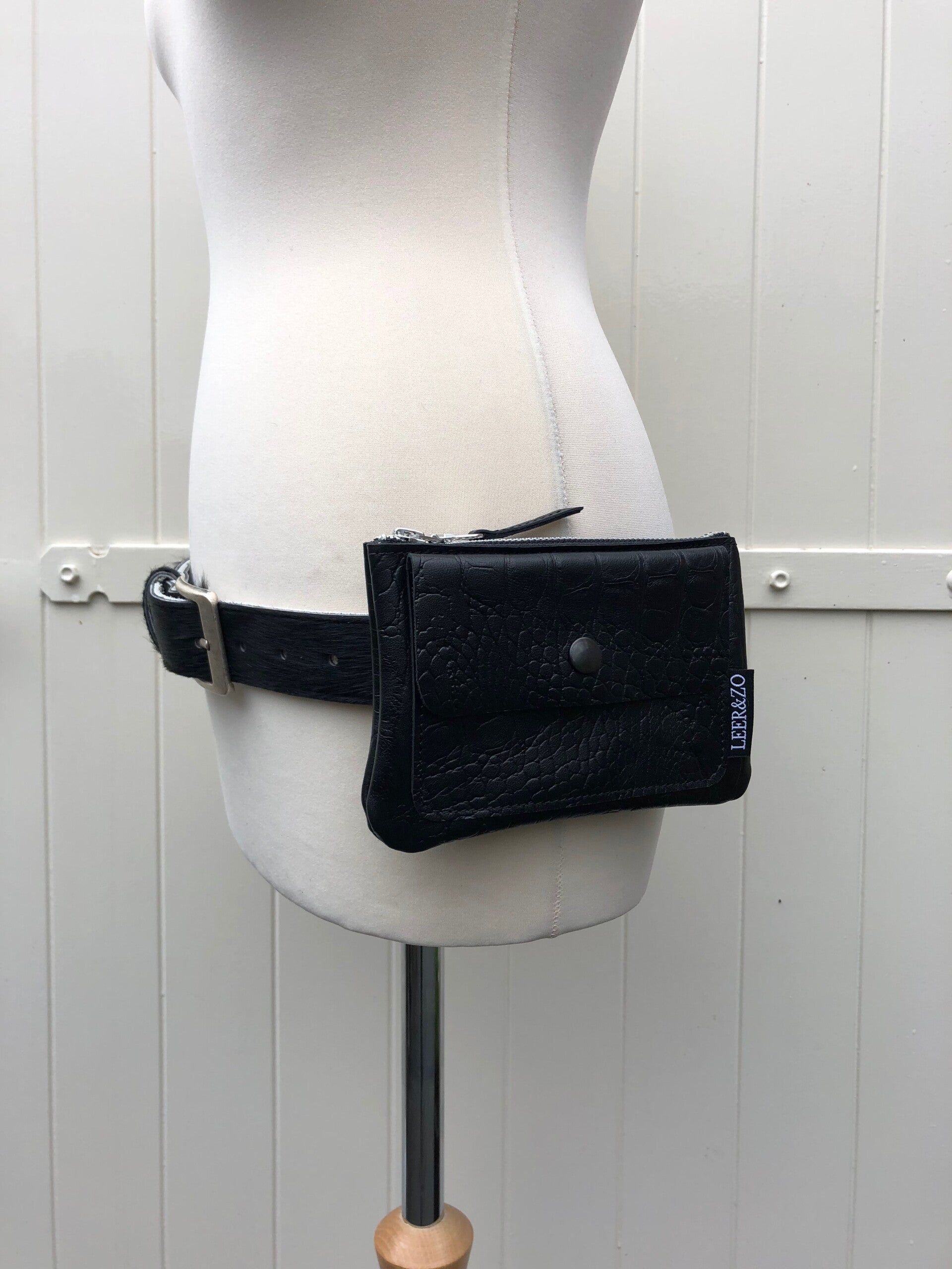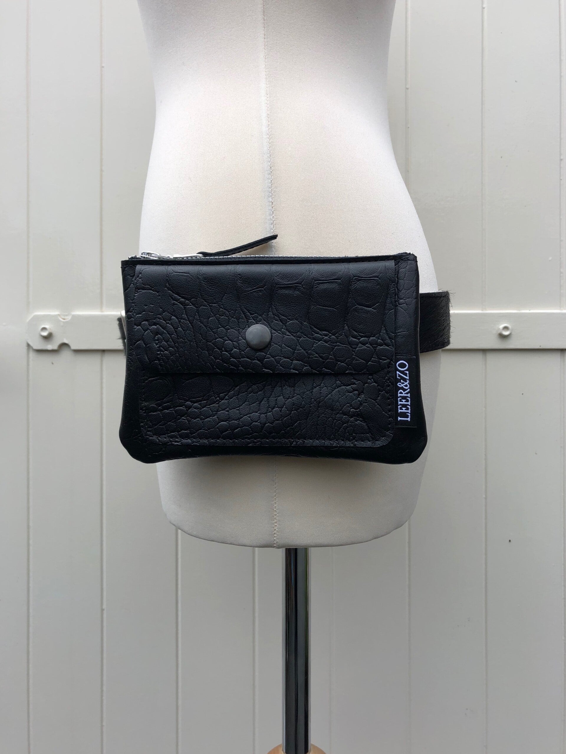 Stoere leren heuptas gemaakt met zwart croco leer voor aan je riem. Ideaal als je de meest belangrijk spullen mee wil nemen en toch heerlijk je handen vrij! Erg handig voor de aankomende zomerfestivals, vakantie, dagje weg of op de fiets! Groot genoeg voor je mobiel, geld, pasjes, make-up en je sleutels.