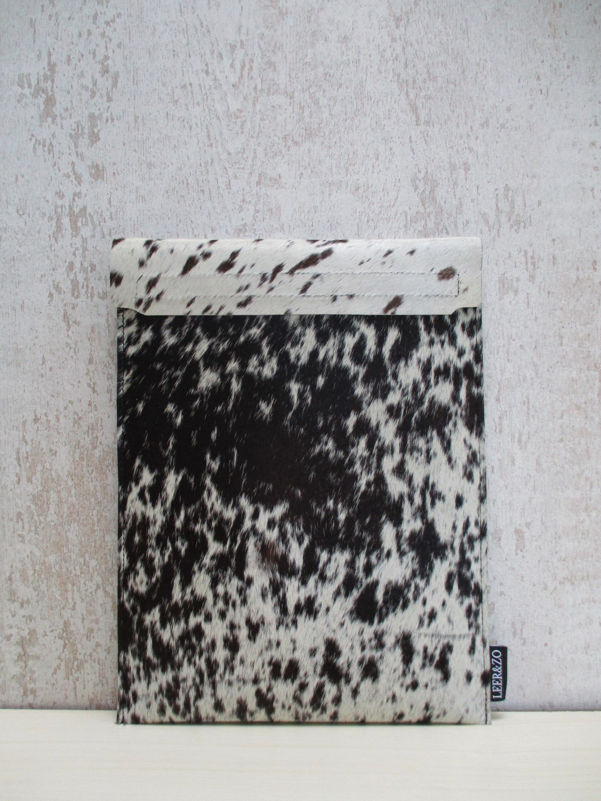 Mooie en stijlvolle laptop hoes voor de Apple MacBook 13 inch. De hoes is handgemaakt van schitterend donkerbruin/wit koeienhuid. De hoes is perfect om je laptop veilig en krasvrij in op te bergen. Sluit doormiddel van een flap met klittenband sluiting.