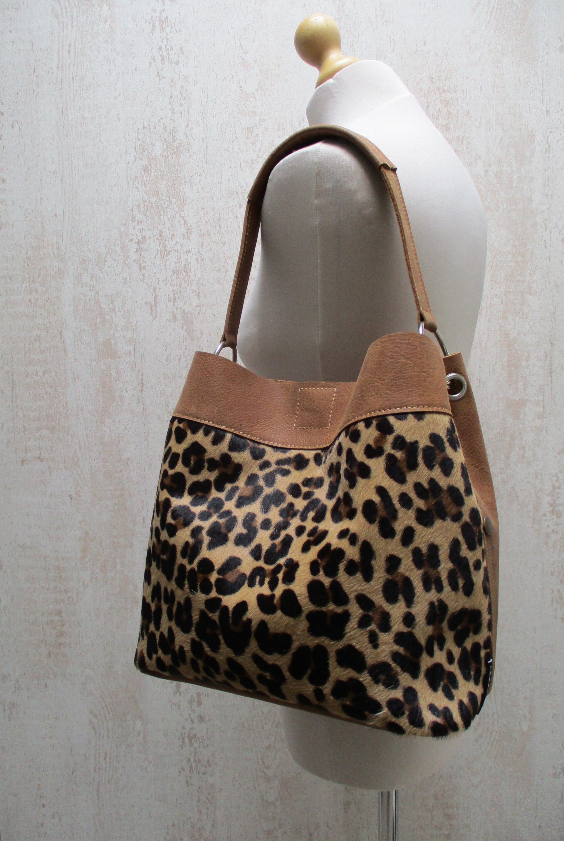 cognac leren buideltas met luipaard print koeienhuid