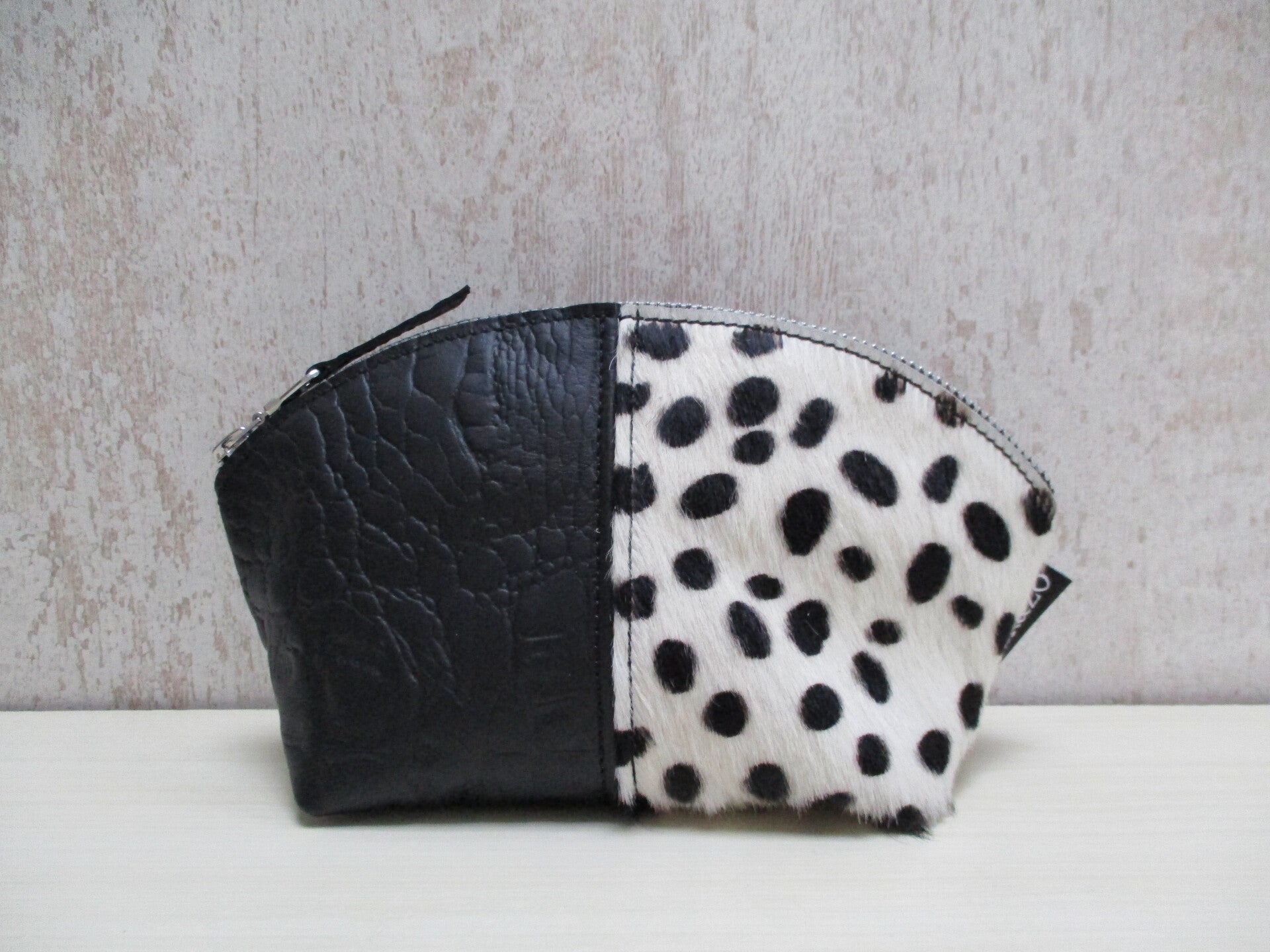 Stoere handgemaakte leren make-up tas met croco en dalmatiërprint koeienhuid. Het is een handig rond model waardoor je een goed overzicht hebt op al je make-up spulletjes. En ideaal om mee te nemen in je handtas. Door de brede bodem is de make-up tas lekker ruim, en aan de bovenzijde voorzien van stevige YKK rits.