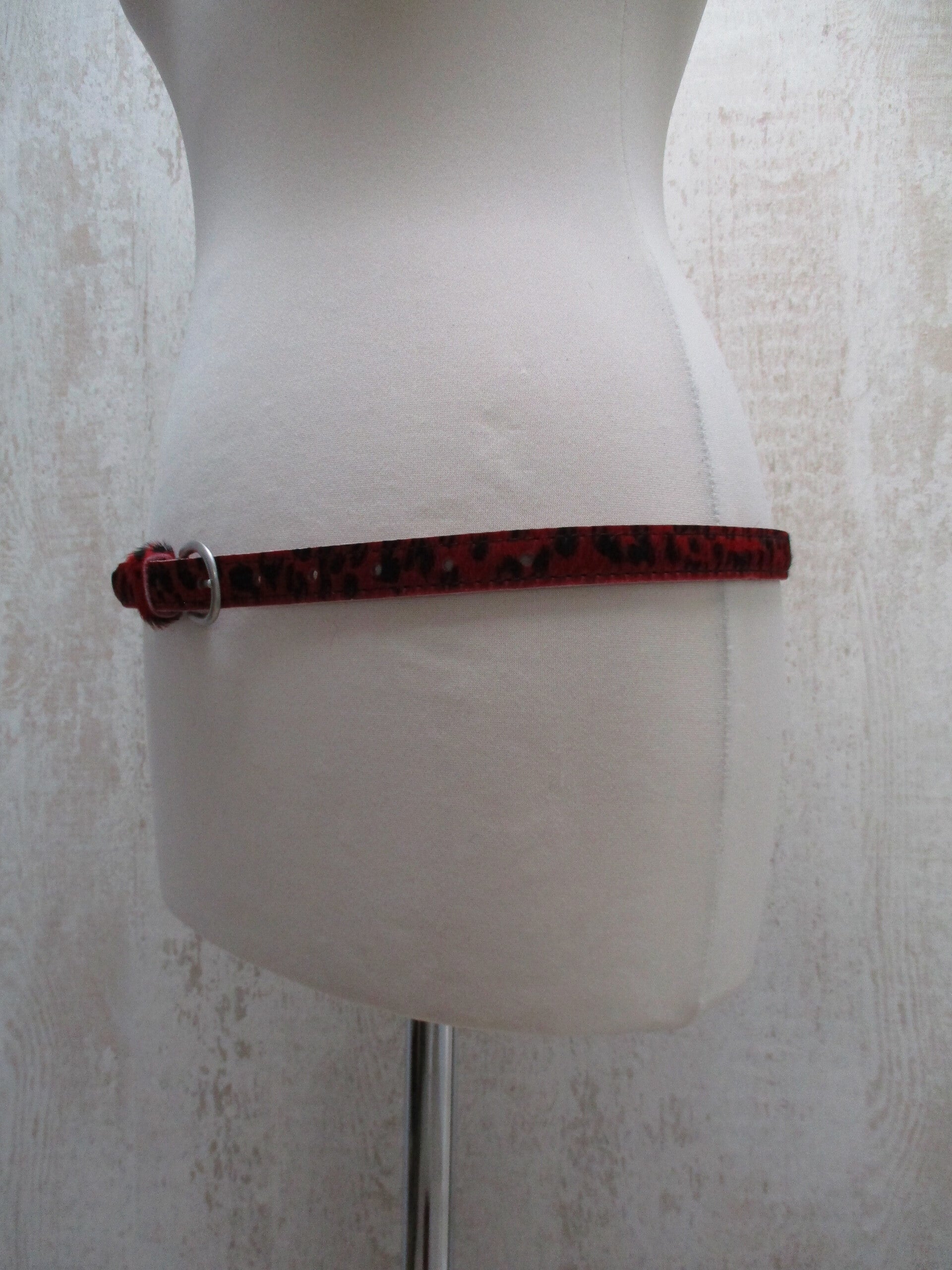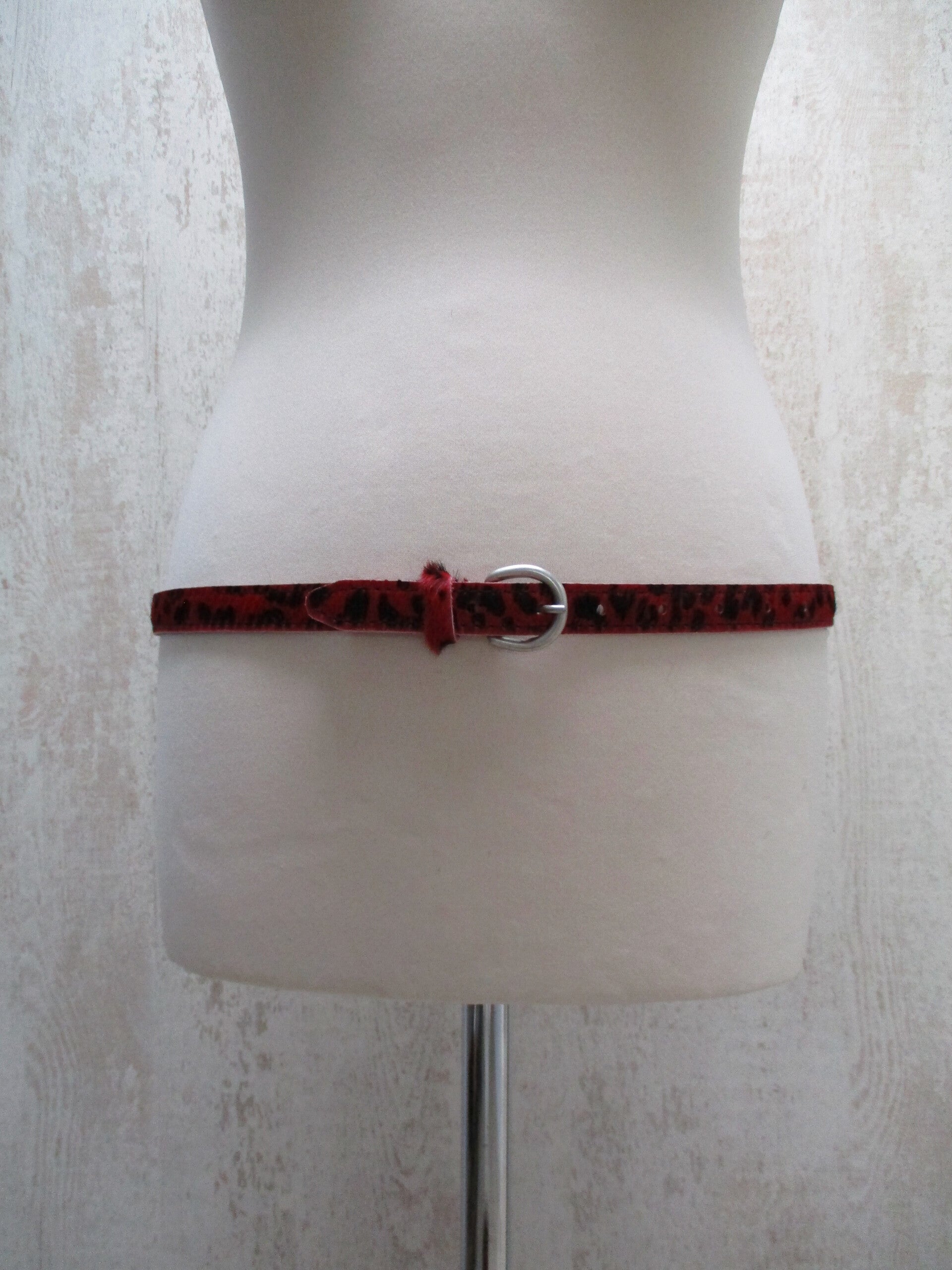 Mooie stijlvolle smalle damesriem met rkoeienhuid luipaard print. De riem is stoer te dragen op een jeans of lekker casual. En voorzien van een elegante zilveren gesp. De breedte van de riem is 2 cm.