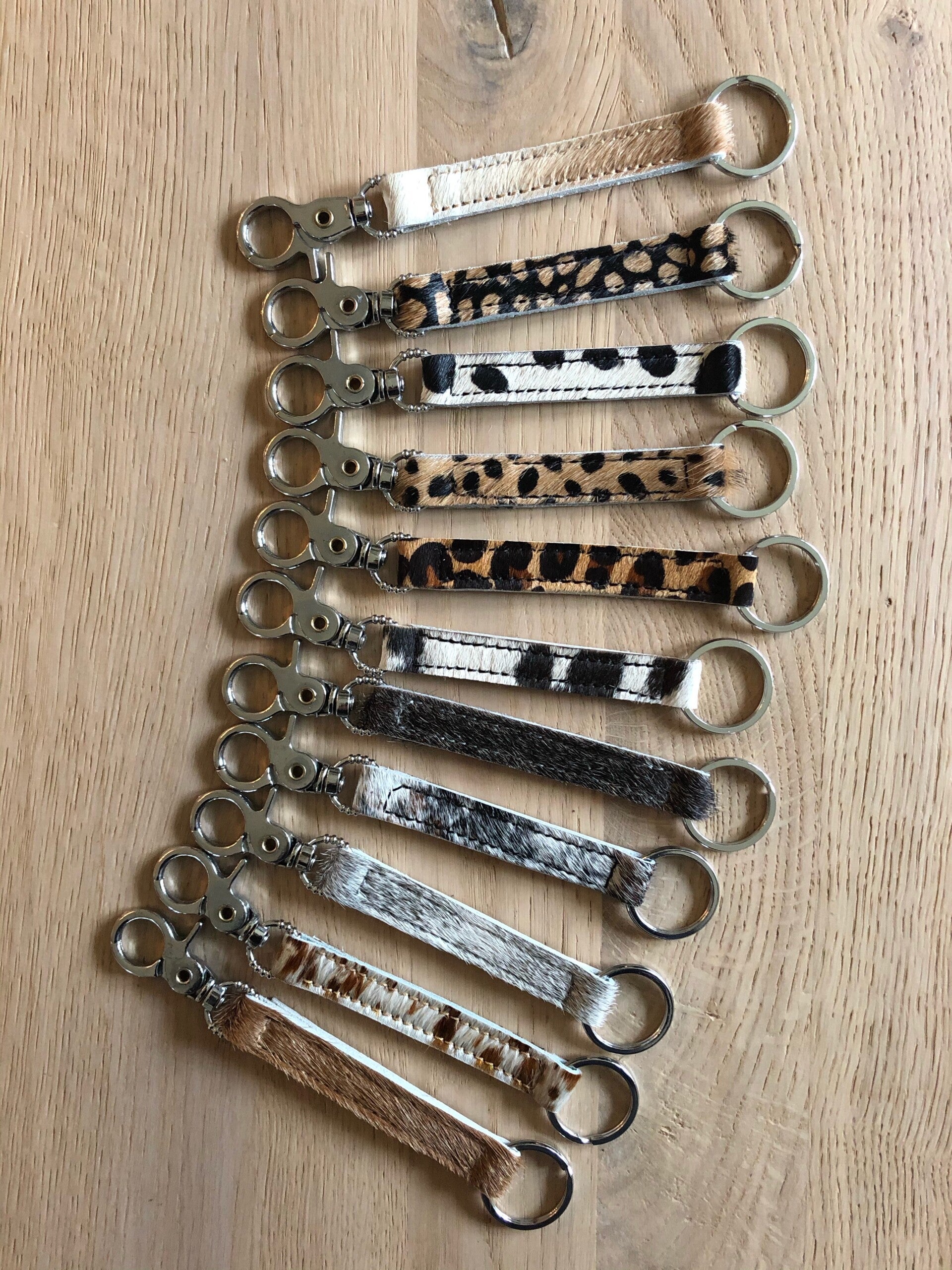 Super handige sleutelhanger, aan de ene kant een sleutelring en aan de andere kant een handige clip om je sleutel er makkelijk & snel vanaf te halen. Verkrijgbaar in diverse mooie dierenprints en koeienhuid.