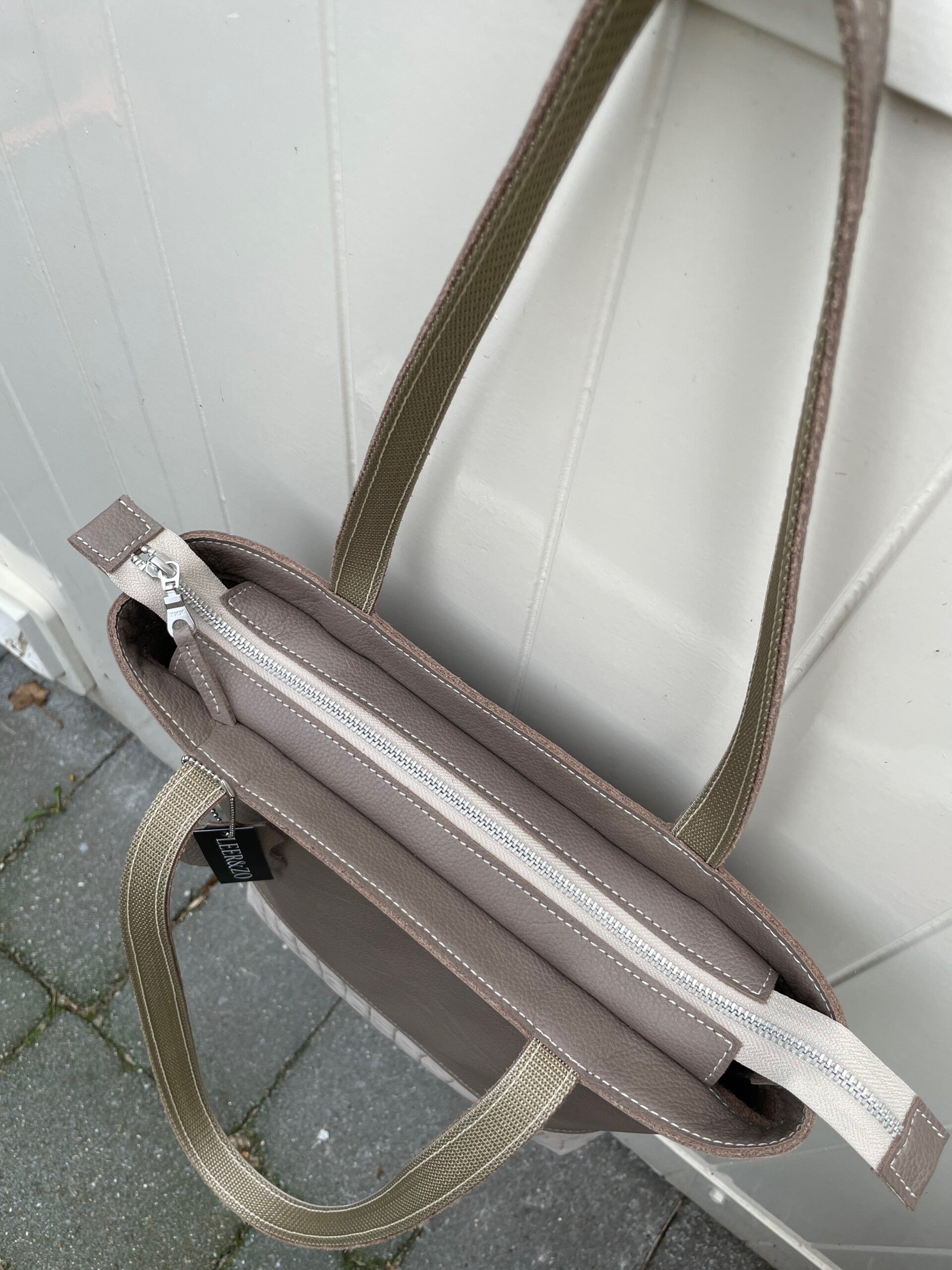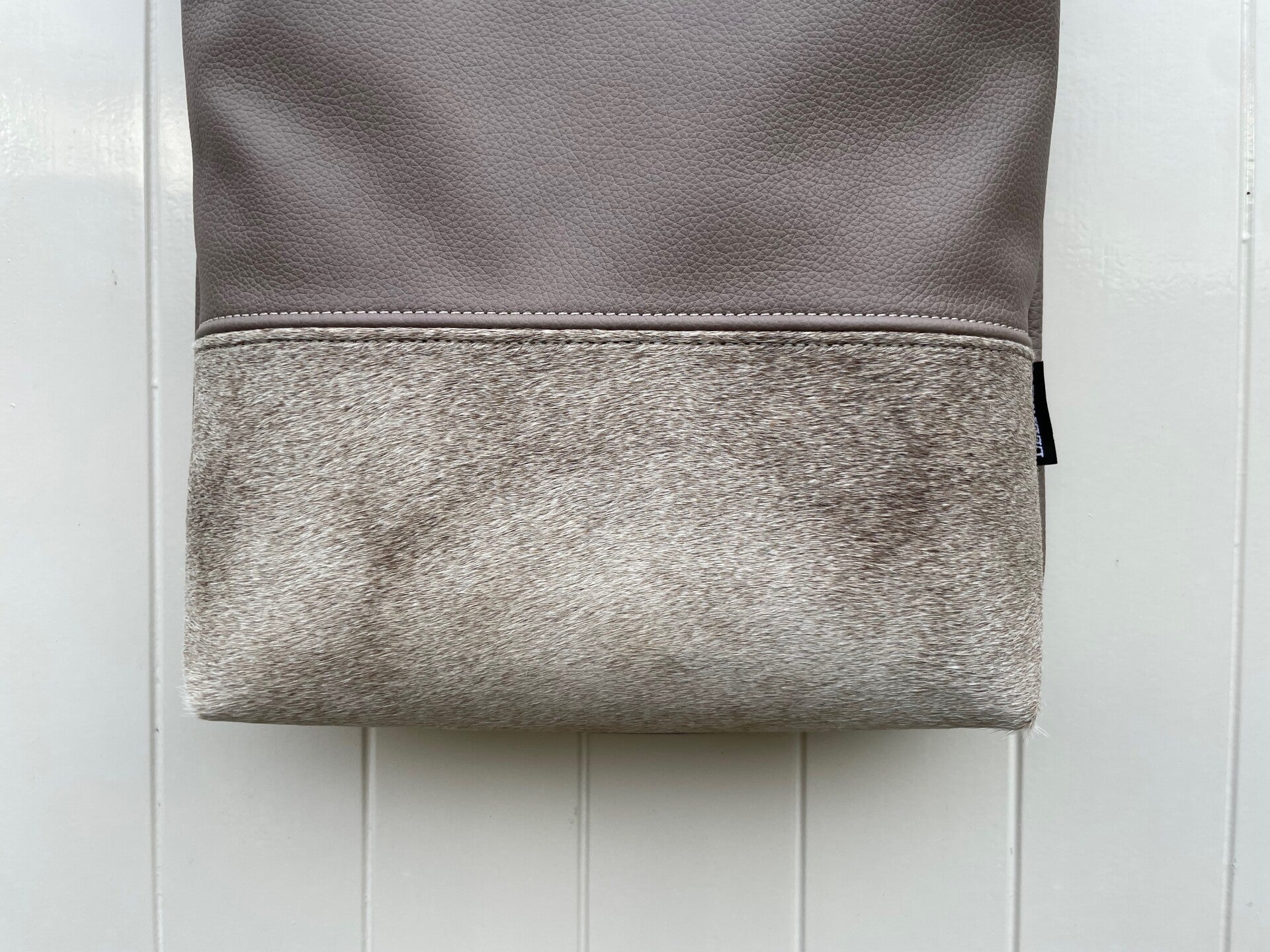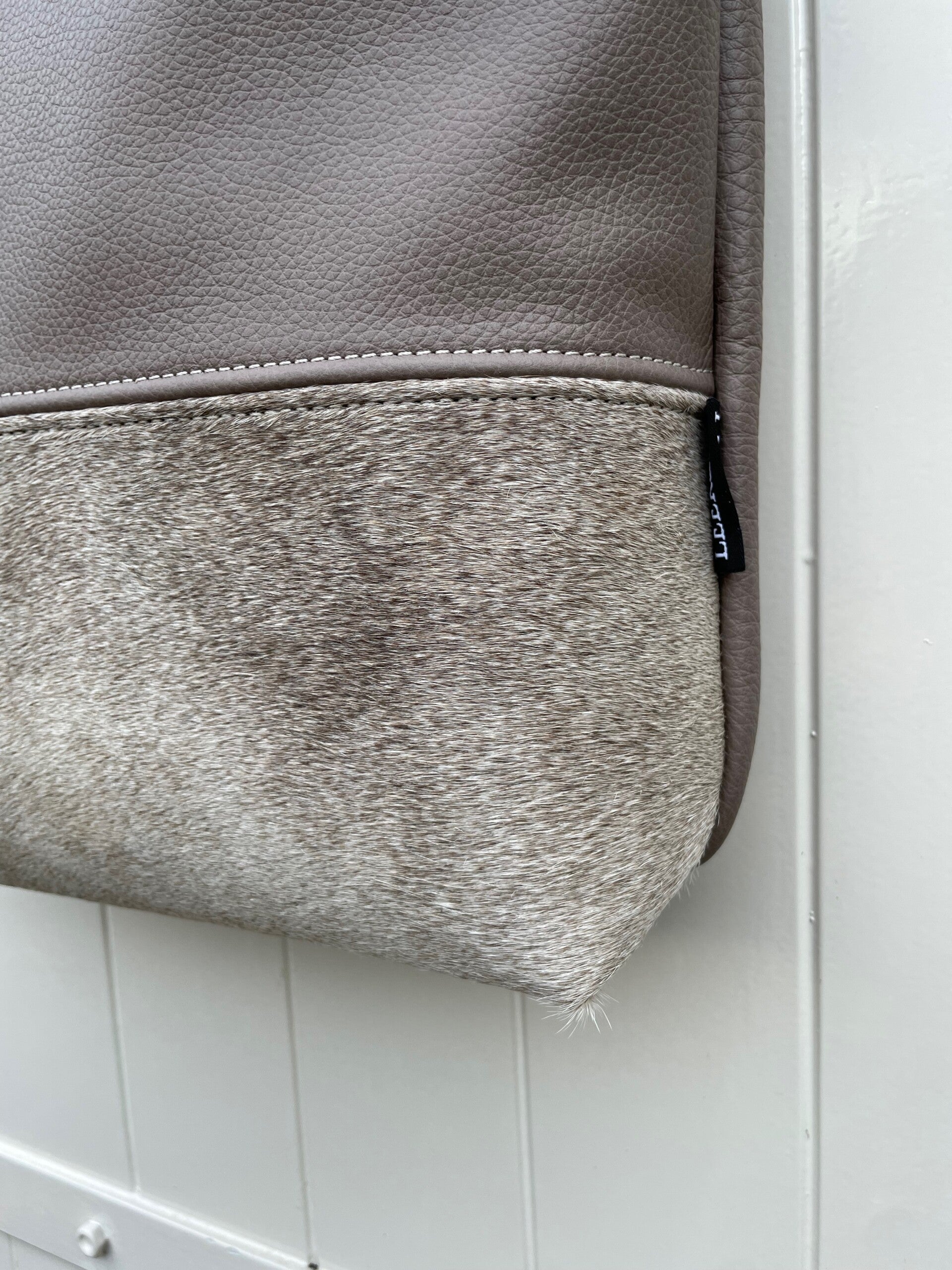 Prachtige taupe leren Tote Bag shopper met aan de onderzijde uniek taupe/beige koeienhuid. Deze geweldige tas is multifunctioneel en heerlijk ruim. Te gebruiken als laptoptas/studietas of gewoon als shopper. Er is ruimte genoeg voor laptop, schrijfmap, agenda en andere spullen.