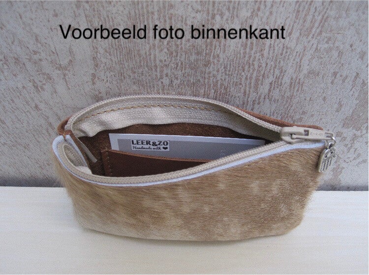Handzaam en multifunctioneel koeienhuid etuitje. Te gebruiken voor het opbergen van bankpassen, visitekaartjes, geld, sleutel etc. Handig voor in je tas om al je spulletjes netjes bij elkaar te houden. Aan de binnenzijde voorzien van een creditcard vakje. Afsluitbaar doormiddel van een rits.