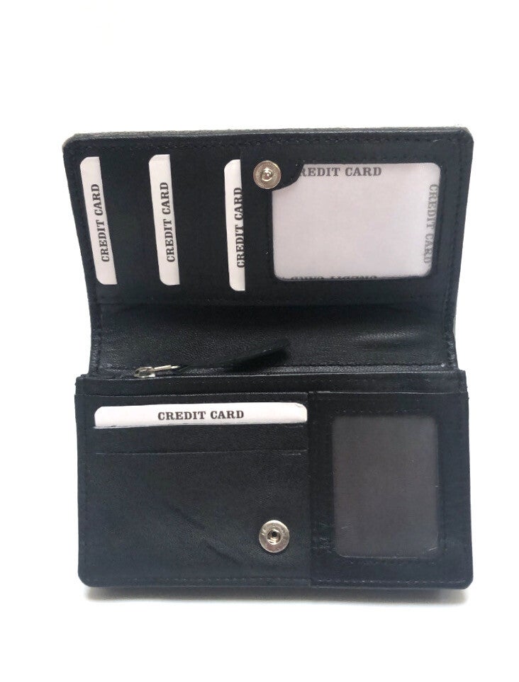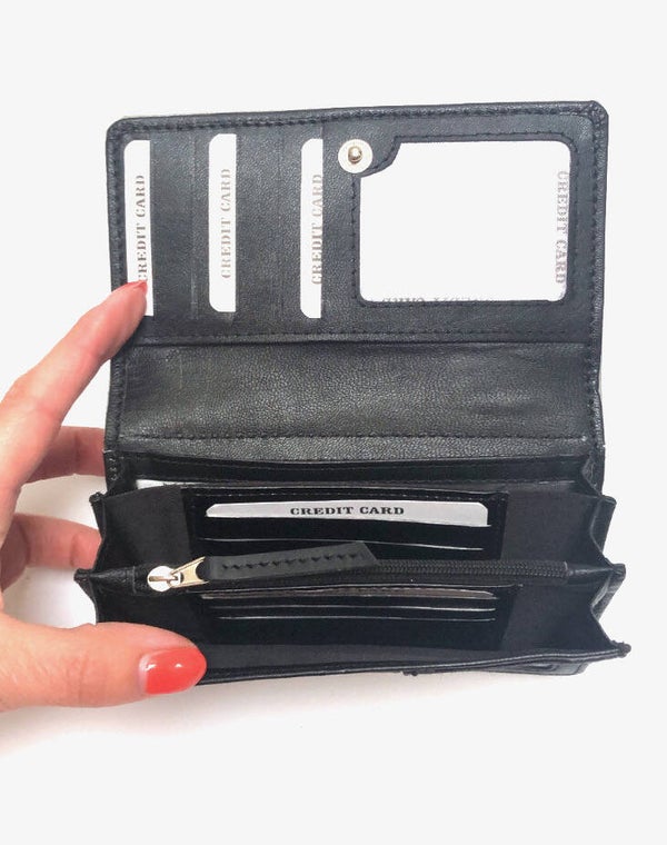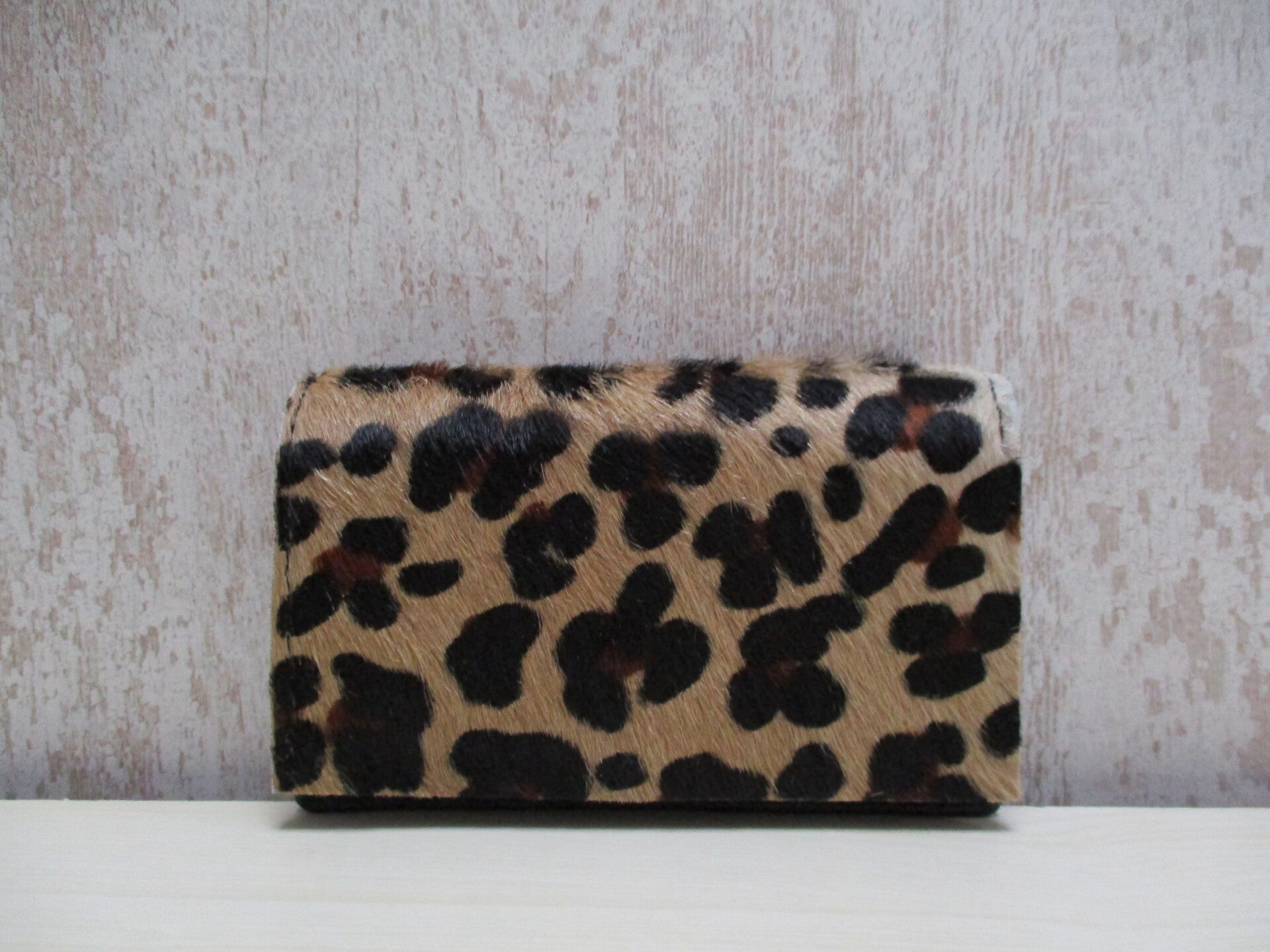 Mooie zwart leren portemonnee met koeienhuid luipaard print. Het is een iets smaller model, maar voorzien van extra vak. En daarom uitermate geschikt voor de wat kleinere handtassen.