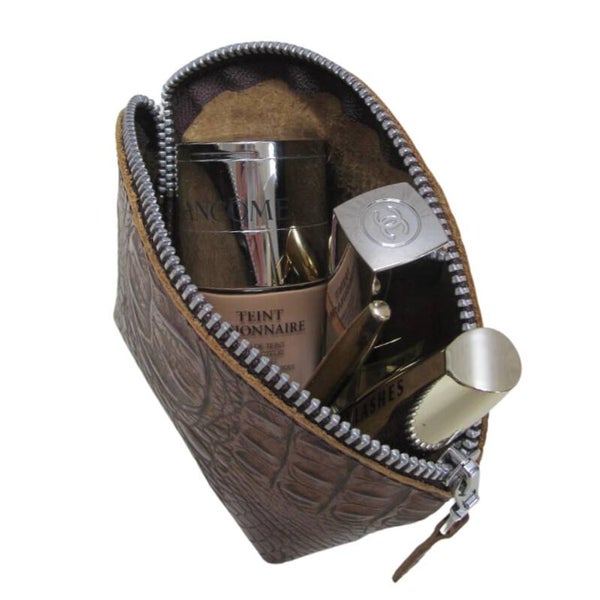 Super handig en stijlvol klein leren make-up tasje met cognac croco print. Het is een handig rond model waardoor je een goed overzicht hebt op al je make-up spulletjes. Het is een mooi formaat en dus ideaal om mee te nemen in je tas. Aan de bovenzijde voorzien van stevige YKK rits.