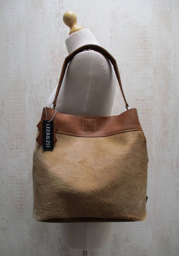 Schitterende buideltas gemaakt van prachtig beige koeienhuid. De achterzijde is van mooi cognac leer. Leuk detail is de kruin in het midden van de tas. De tas is zowel aan de hand als over de schouder te dragen. De tas sluit doormiddel van een magneetsluiting aan de bovenzijde. De afmetingen zijn H28 x B30 x D16cm.