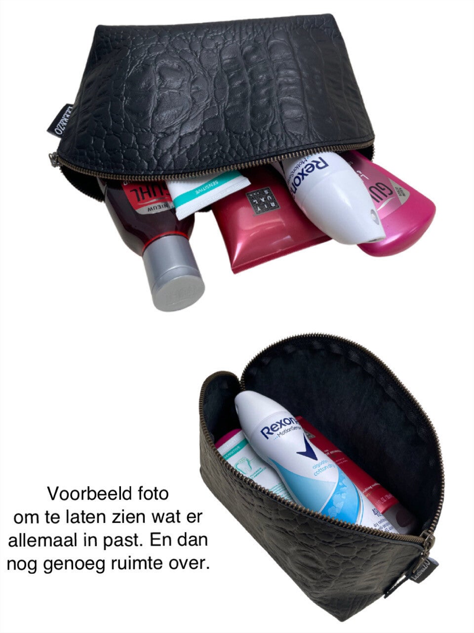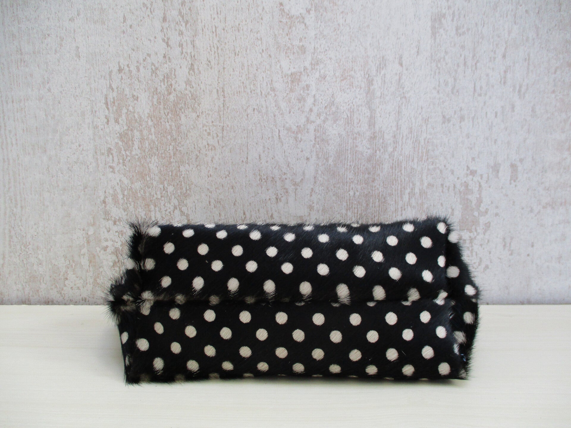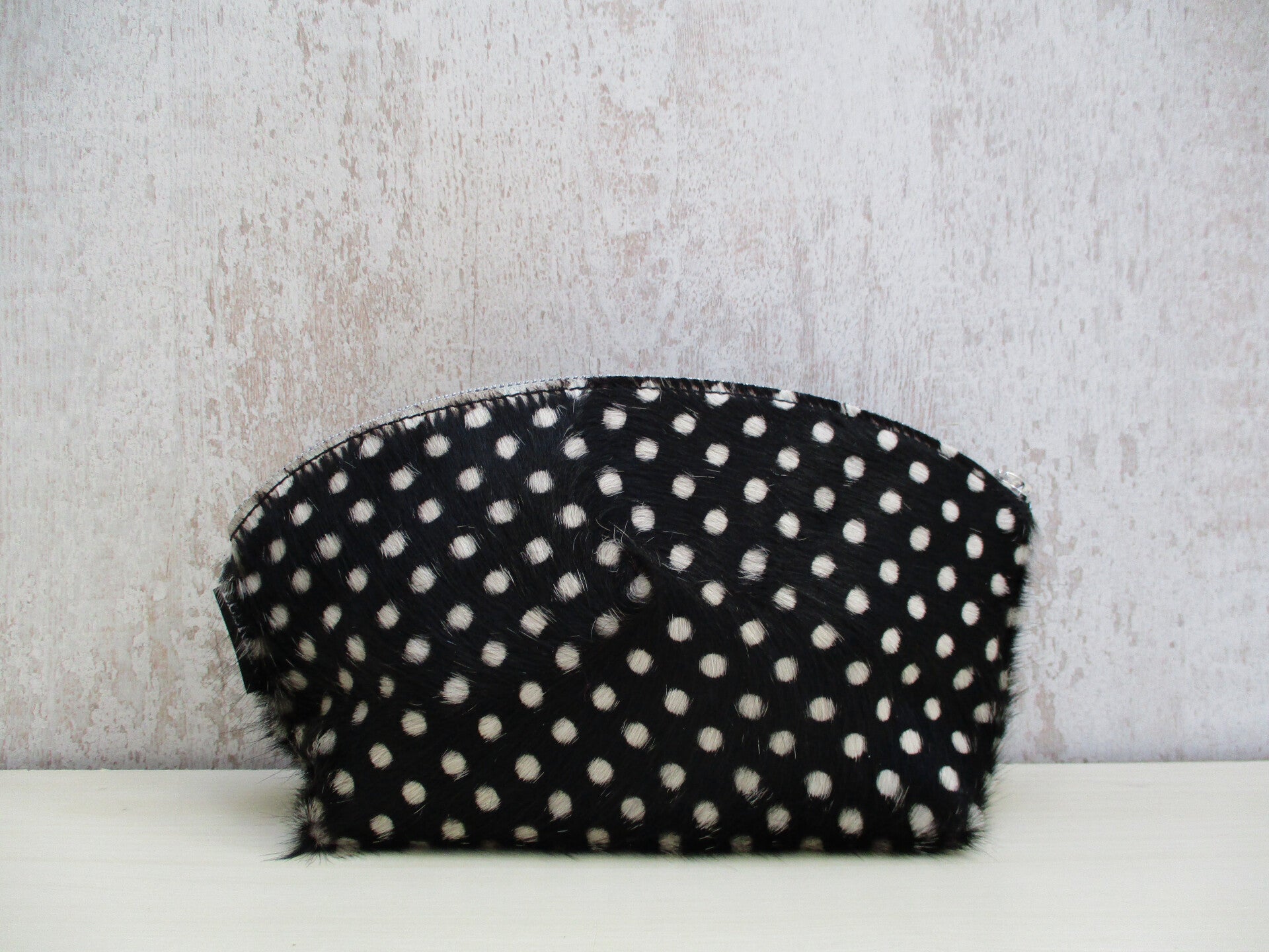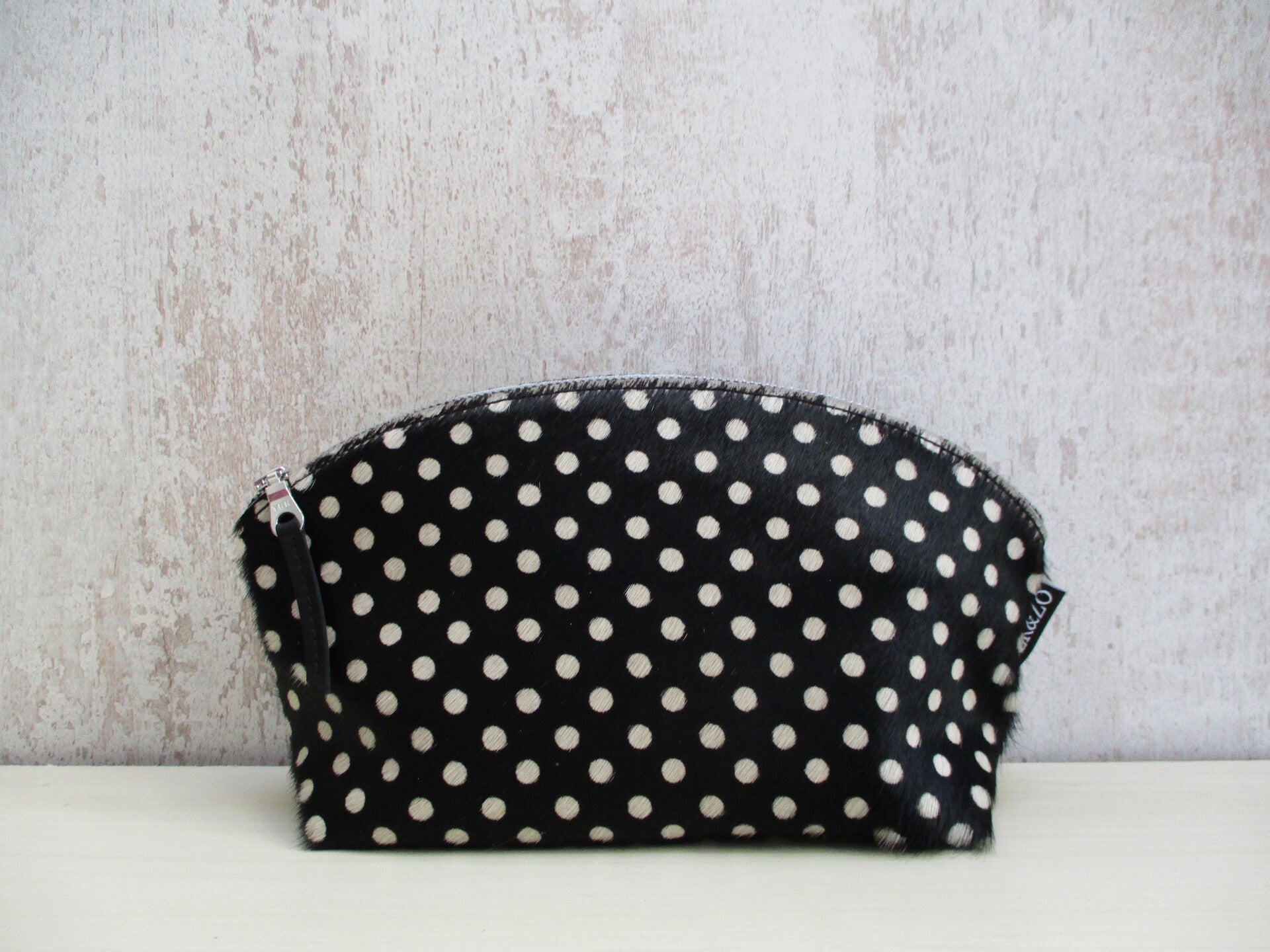 Schitterende handgemaakte ruime toilettas van sublieme kwaliteit koeienhuid met dots print. Het is een handig rond model waardoor je een goed overzicht hebt op al je make-up en toilet spulletjes. Door de brede bodem is de toilettas lekker ruim, en aan de bovenzijde voorzien van stevige YKK rits.
