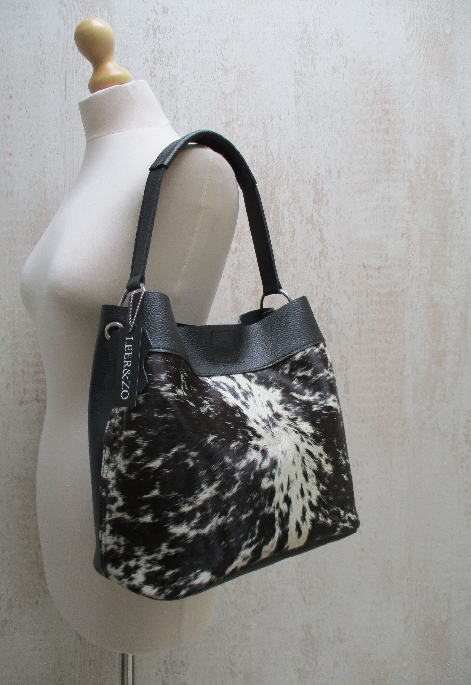 Schitterende buideltas gemaakt van zwart/wit gevlekte koeienhuid. De achterzijde is van mooi zwart leer. De tas is zowel aan de hand als over de schouder te dragen. En sluit doormiddel van een magneetsluiting aan de bovenzijde. De afmetingen zijn H28 x B30 x D16cm.