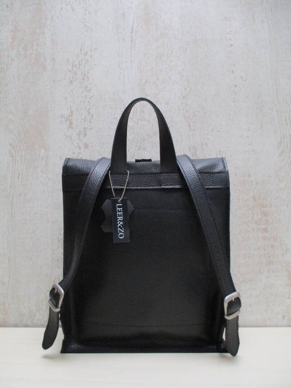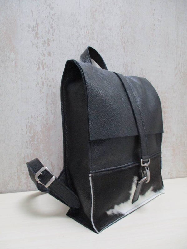 Prachtige handgemaakte leren rugtas van mooi zwart leer. Met aan de onderzijde zwart/wit koeienhuid. Aan de binnenzijde zit er nog een apart vak die afsluitbaar is met een rits (H20XB22 cm) En sluit doormiddel van een stoere zilveren musketonhaak op de voorzijde.