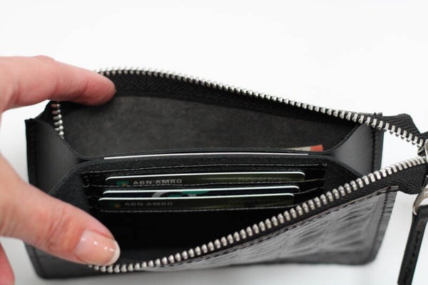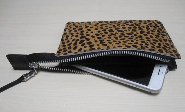 Super handzaam en multifunctioneel etui/portemonneetje. Gemaakt van mooie koeienhuid met cheetah print. Aan de binnenzijde voorzien van 2 grote vakken en klein vakje en 3 creditcardvakjes. Te gebruiken voor het opbergen van bankpassen, visitekaartjes, geld, sleutel etc. En er is ook ruimte voor je telefoon. Handig voor in je tas om al je spulletjes netjes bij elkaar te houden. Afsluitbaar doormiddel van een rits.