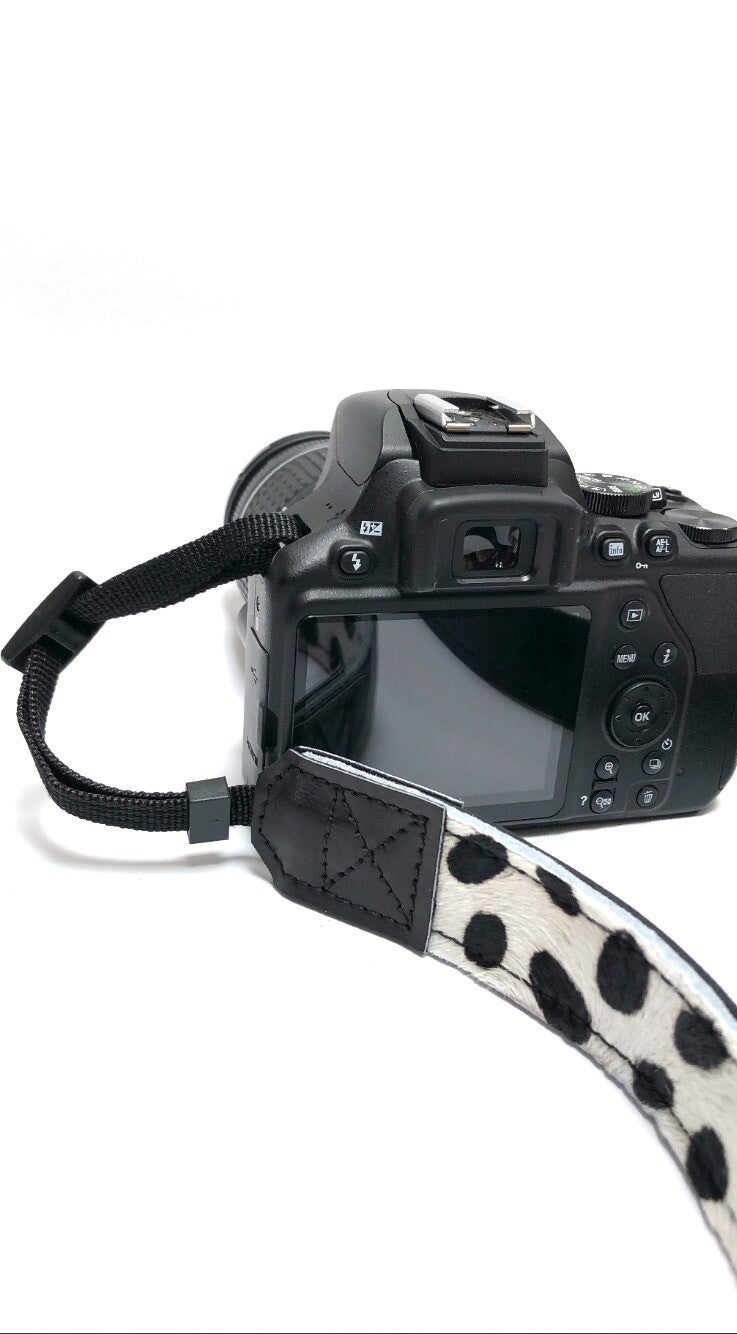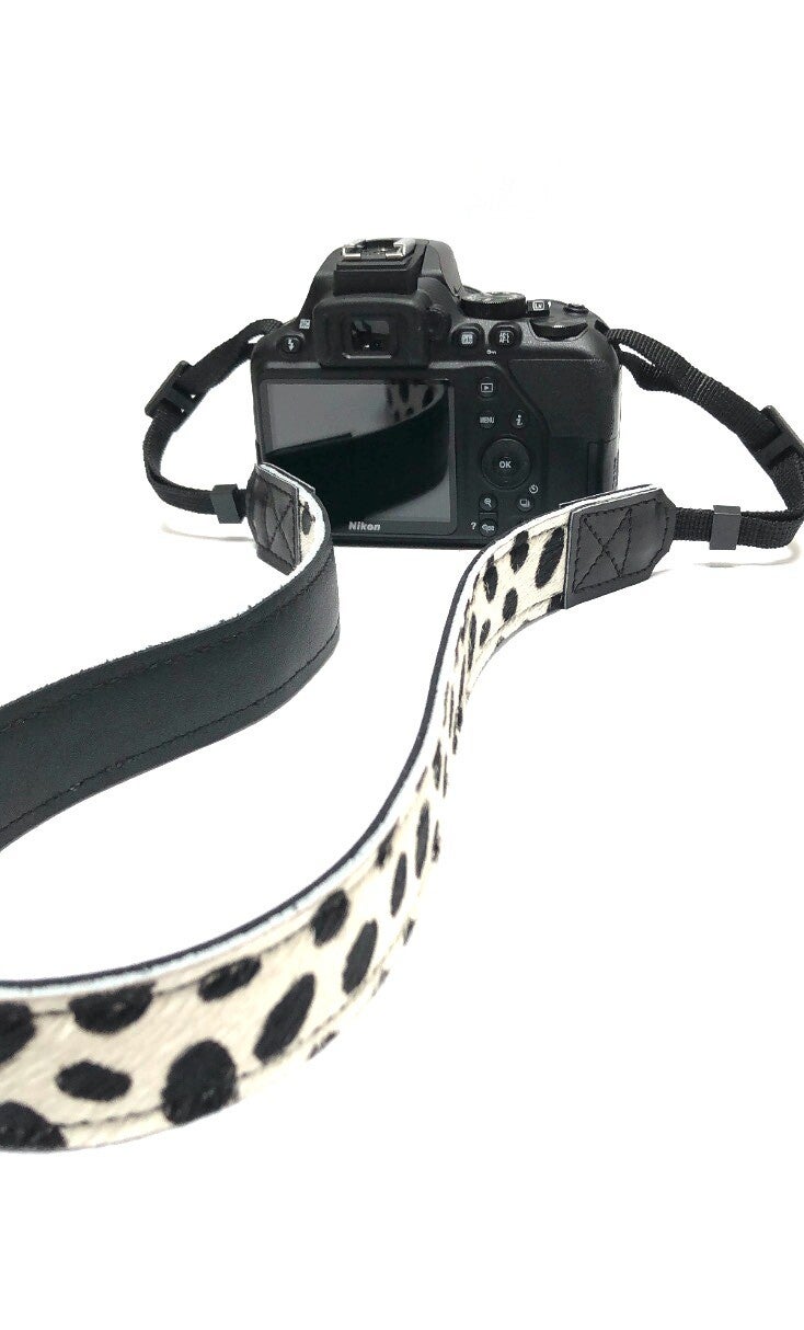 Ga stijlvol op pad met deze stoere camerariem. De camerariem is gemaakt van koeienhuid met dalmatier print. Aan de onderzijde voorzien van zacht soepel zwart leer. De strap wordt geleverd met universele verstelbare gespen, zodat die voor vrijwel geschikt is voor de meeste camera merken (DLSR / Nikon/ Canon / Sony) De breedte van de bevestiging aan de camera is 1 cm.