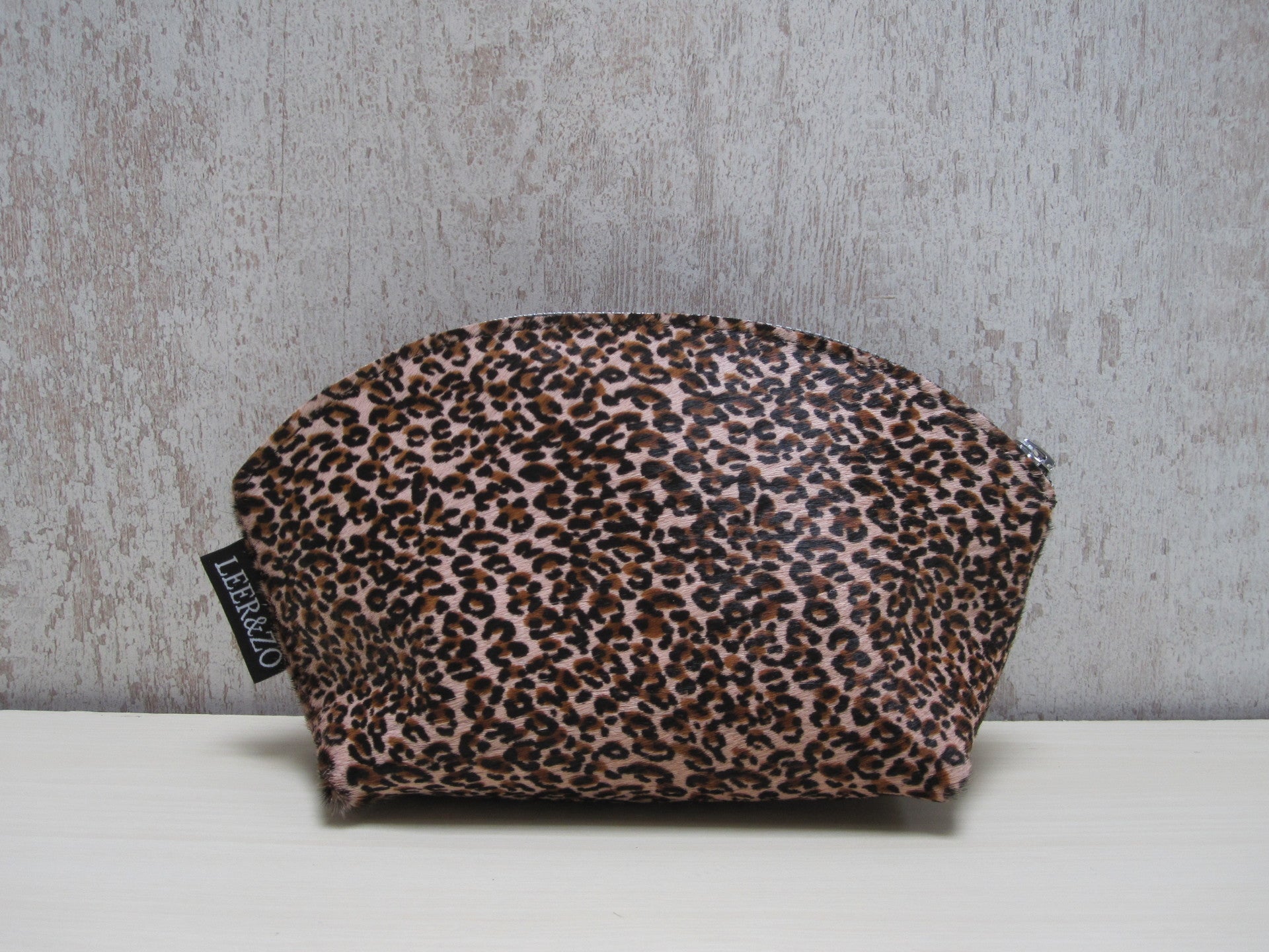Schitterende handgemaakte make-up tas van sublieme kwaliteit koeienhuid met roze luipaard print. Het is een handig rond model waardoor je een goed overzicht hebt op al je make-up spulletjes. En ideaal om mee te nemen in je handtas. Door de brede bodem is de make-up tas lekker ruim, en aan de bovenzijde voorzien van stevige YKK rits.