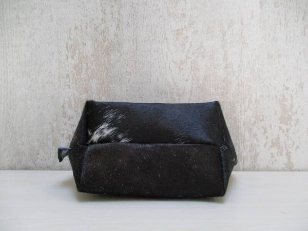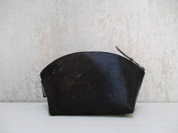 Schitterende handgemaakte make-up tas van sublieme kwaliteit zwart/wit koeienhuid. Het is een handig rond model waardoor je een goed overzicht hebt op al je make-up spulletjes. En ideaal om mee te nemen in je handtas. Door de brede bodem is de make-up tas lekker ruim, en aan de bovenzijde voorzien van stevige YKK rits.