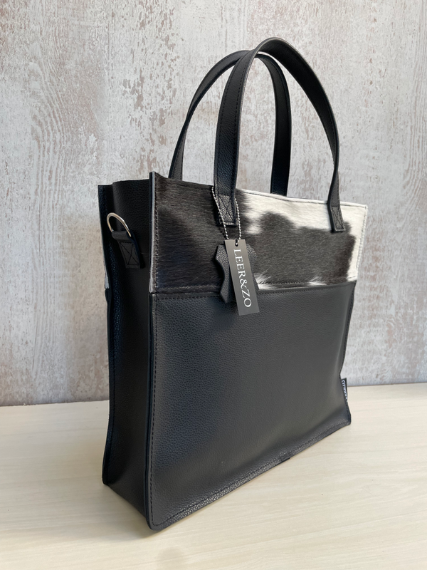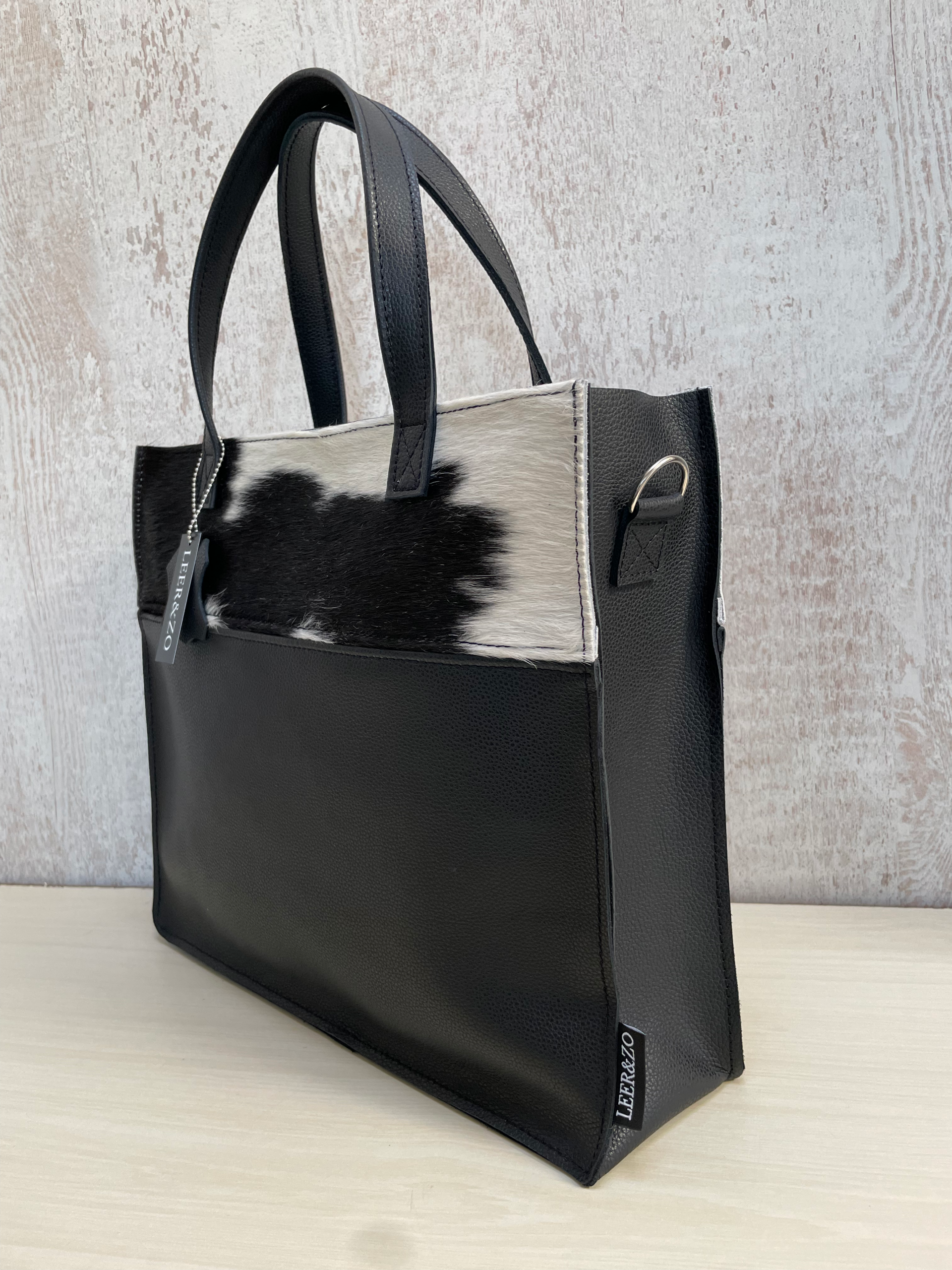 Prachtige leren laptop tas gemaakt van sublieme kwaliteit stevig zwart leer. Met aan de bovenzijde uniek zwart/wit koeienhuid. Deze geweldige tas is multifunctioneel en heerlijk ruim. Te gebruiken als laptoptas/studietas of gewoon als shopper. Er is ruimte genoeg voor laptop, schrijfmap, agenda en andere spullen.