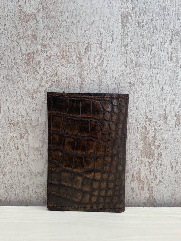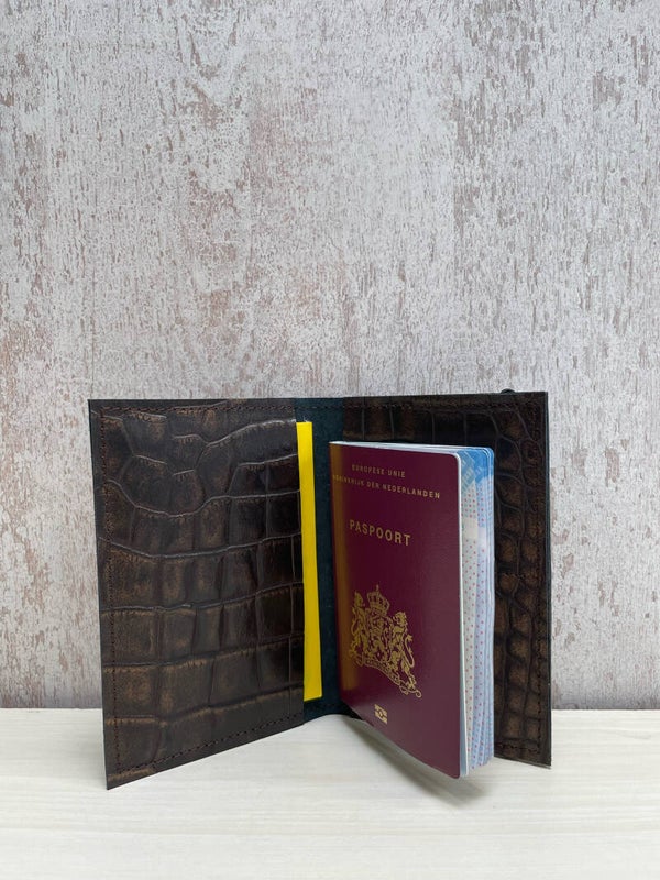 Stoere stijlvolle paspoort hoes gemaakt van uniek leer met donkerbruin/brons croco print. Met ruimte voor je paspoort, vaccinatieboek (gele boekje) en bankpasjes, briefgeld en reistickets. Er zitten ook nog 2 aparte vakjes voor bankpassen.