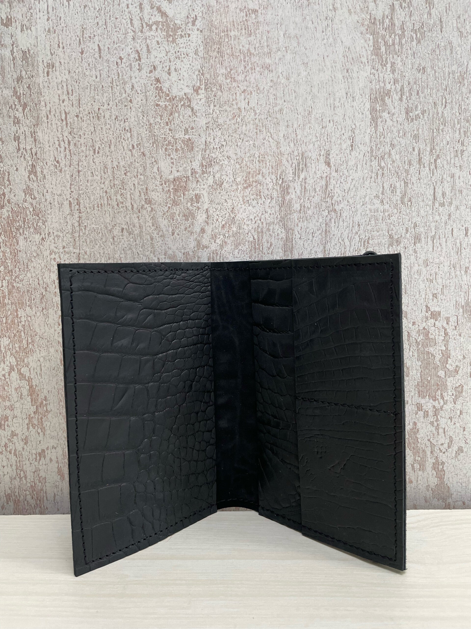 Stoere stijlvolle paspoorthoes gemaakt van uniek zwart leer met croco print. Met ruimte voor je paspoort, vaccinatieboek (gele boekje) en bankpasjes, briefgeld en reistickets. Er zitten ook nog 2 aparte vakjes voor bankpassen.