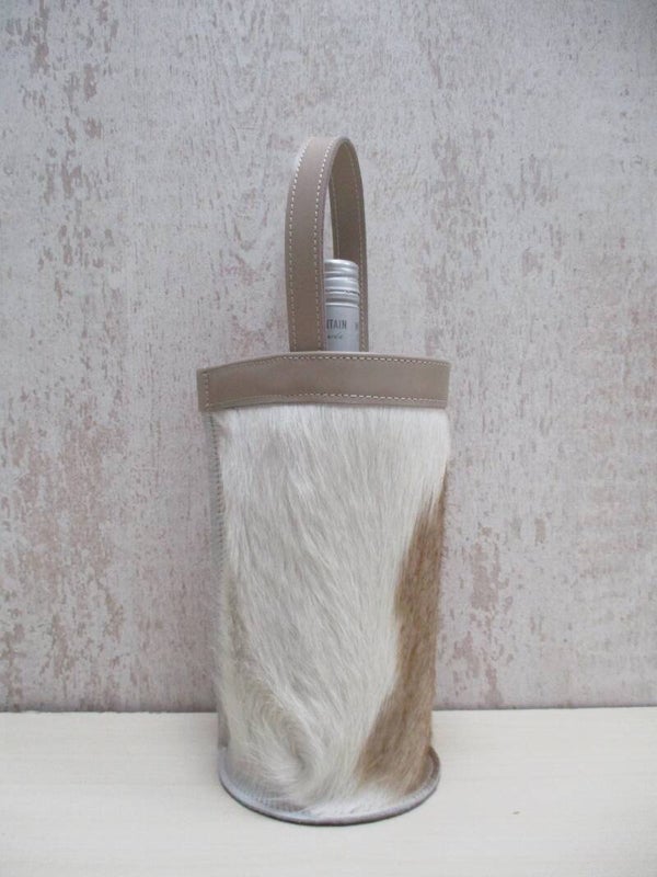 Stijlvolle en originele wijnkoeler gemaakt van een sublieme kwaliteit taupe/wit koeienhuid. De wijnkoelers van LEER&ZO zijn uniek en handgemaakt in eigen atelier. Onwijs leuk cadeau om te geven en te krijgen!