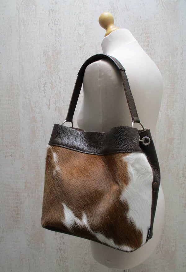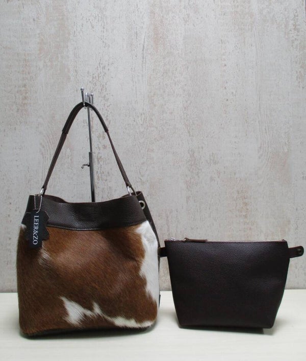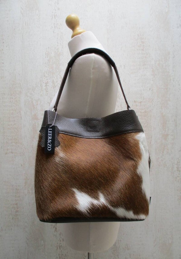 Schitterende donkerbruin leren schoudertas gemaakt met prachtig bruin/wit koeienhuid. Leuk detail in de kruin in het midden van de tas. De achterzijde is van mooi donkerbruin leer. De tas is zowel aan de hand als over de schouder te dragen. En sluit doormiddel van een magneetsluiting aan de bovenzijde. De afmetingen zijn H28 x B30 x D16cm.