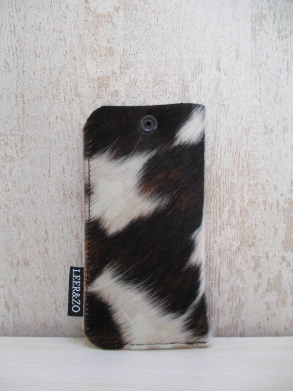 Stijlvolle handgemaakte brillenhoes van uniek tricolor koeienhuid. In deze brillenhoes is je bril netjes en veilig beschermd tegen vallen, stoten en krassen. Sluit doormiddel van een drukknoopje aan de bovenzijde.