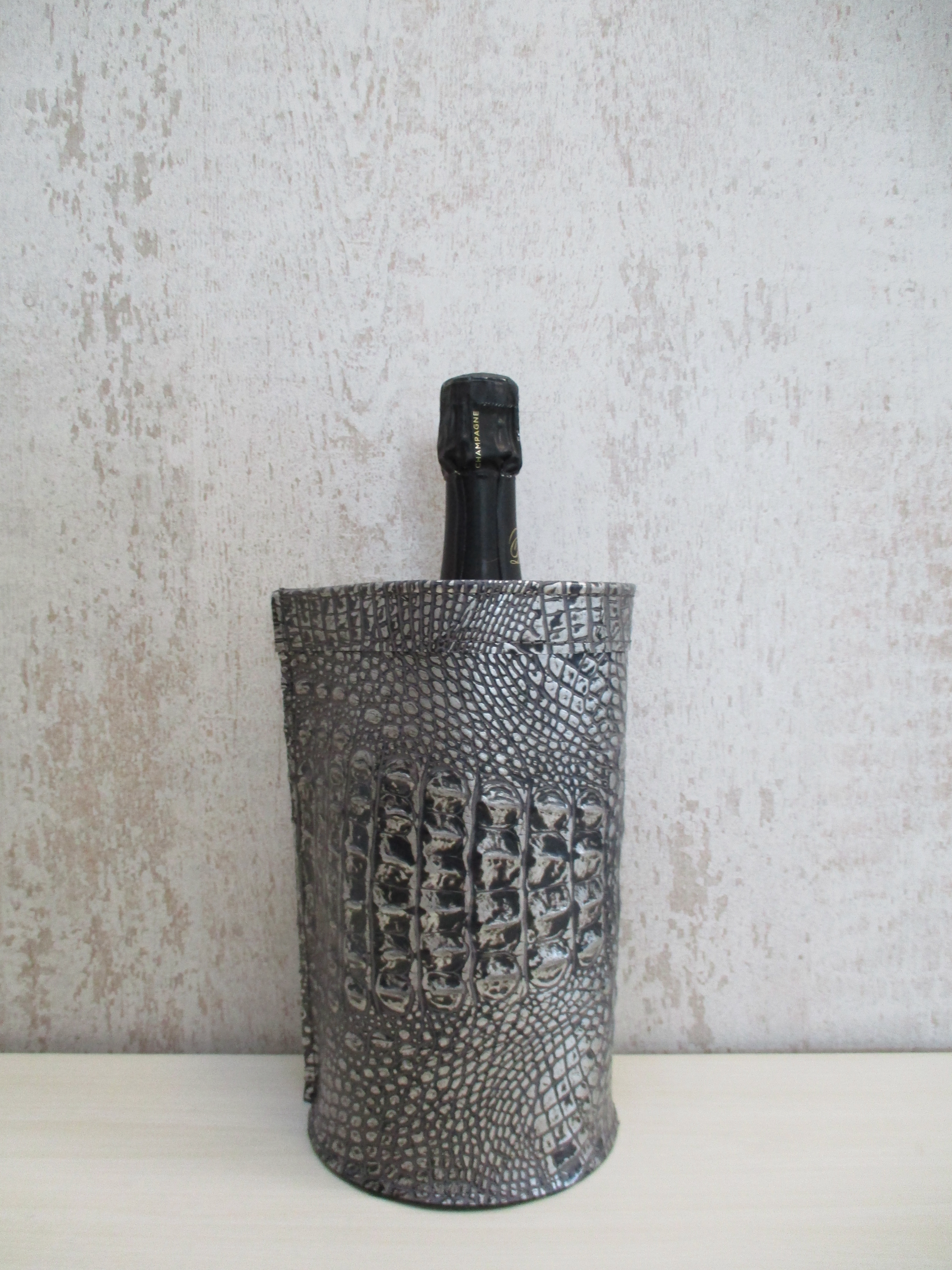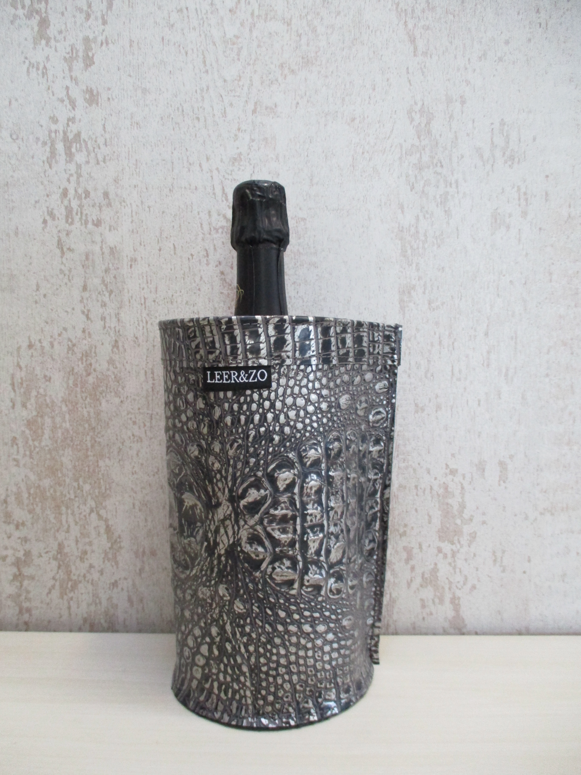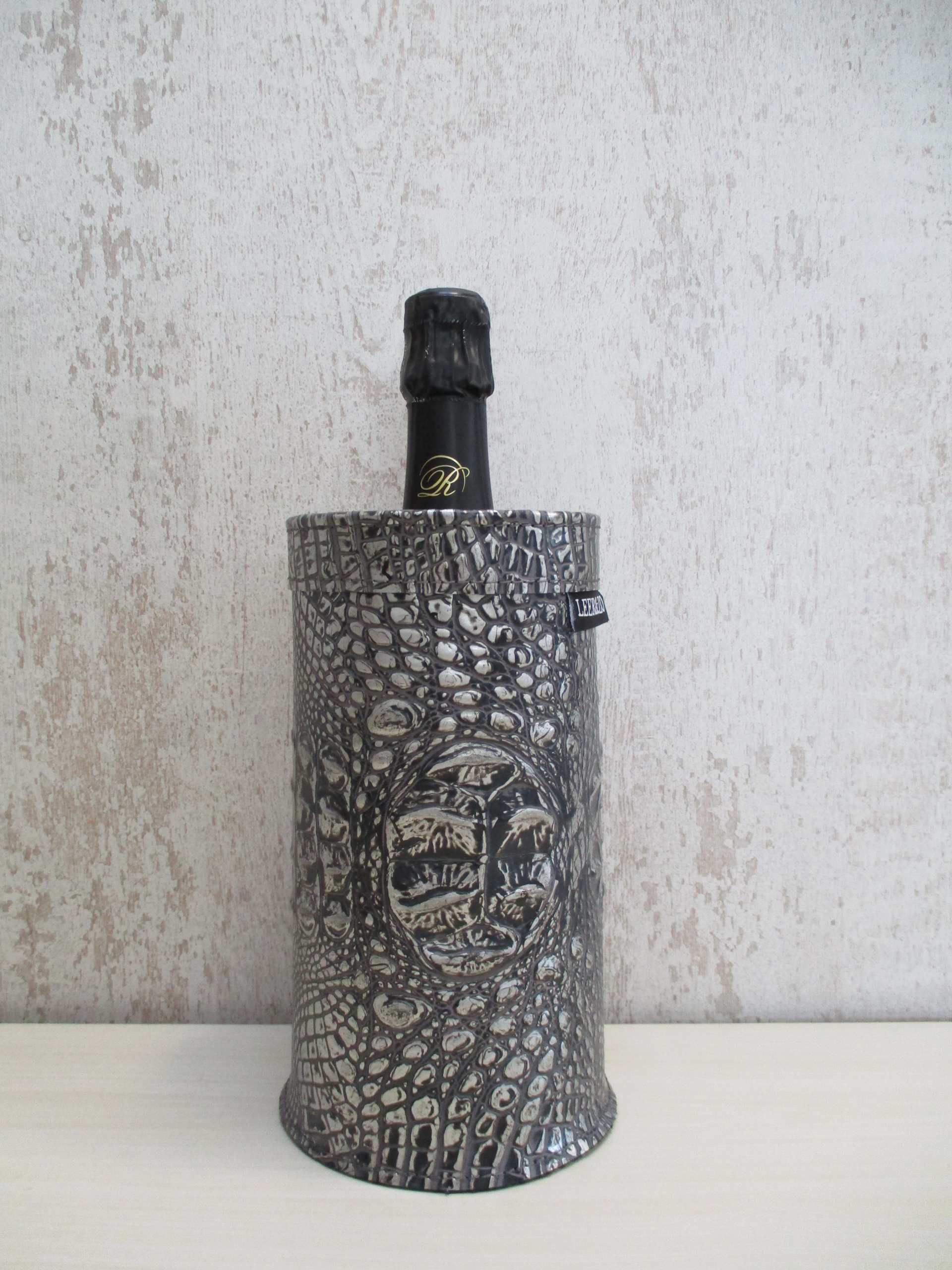 Zeer stijlvolle en exclusive leren champagnekoeler met uniek zilver crocodille print. Deze champane is praktisch in gebruik en laat de fles mooi uitkomen.