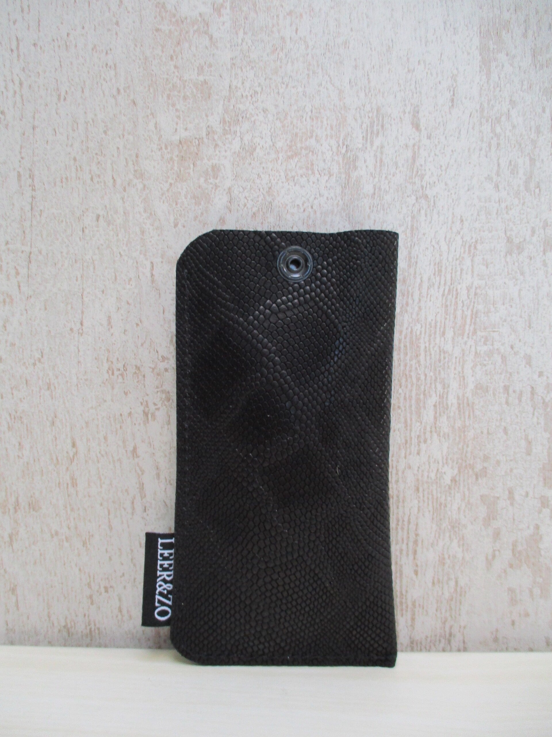 Bescherm je bril of zonnebril in deze stijlvolle leren brillenhoes, gemaakt van prachtig zwart leer met slangen print. In deze brillenhoes is je bril netjes en veilig beschermd tegen vallen, stoten en krassen. Sluit doormiddel van een drukknoop aan de bovenzijde.