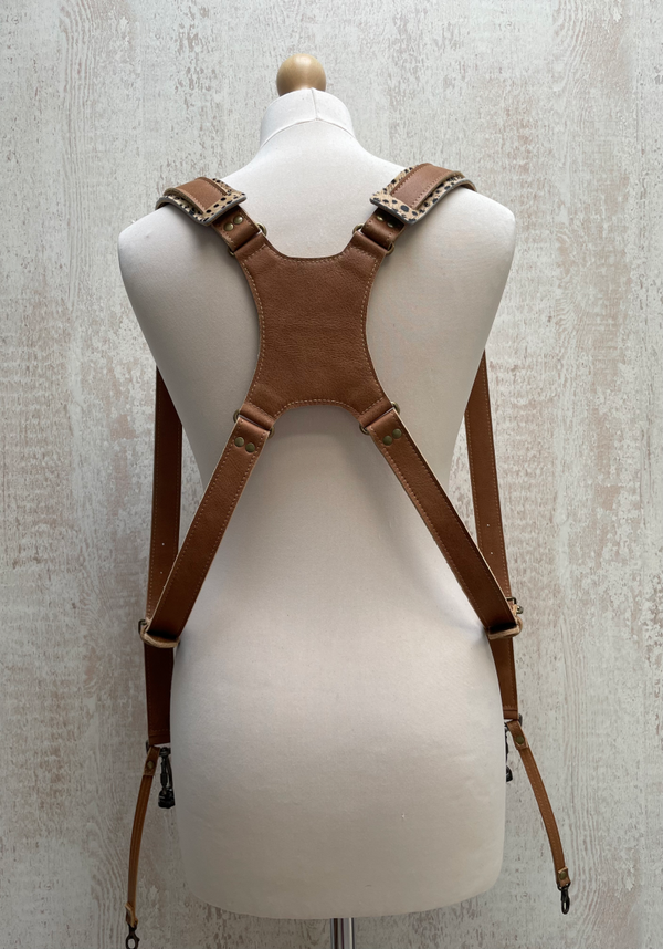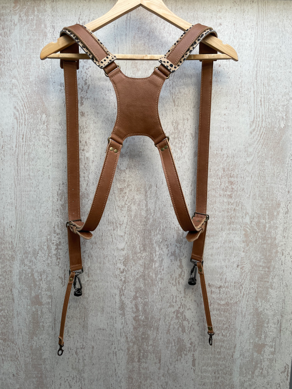 Met deze stoere leren camera harnas draag je gemakkelijk twee camera's met je mee. Het harnas verdeeld het gewicht van beide camera's zodat je vrij kan bewegen en minder last krijgt van je schouders, nek of rug. Door de veiligheid en het comfortabele dragen van de harnas is deze perfect voor lange fotografie dagen. Denk aan bijvoorbeeld bruidsfotografie of familieshoots.