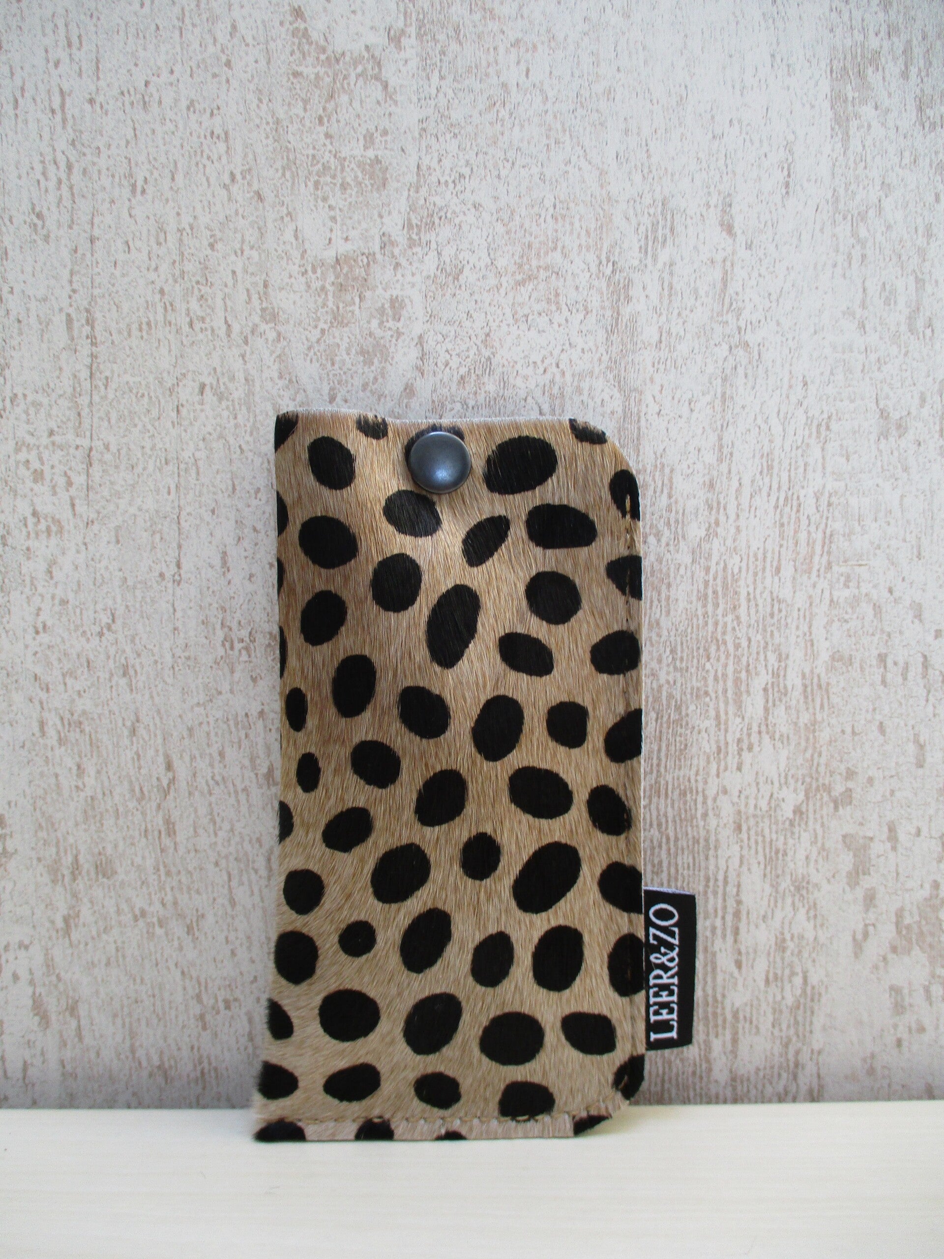 Bescherm je bril of zonnebril in deze stijlvolle leren brillenhoes, gemaakt van prachtig dalmatiër/cognac koeienhuid. In deze brillenhoes is je bril netjes en veilig beschermd tegen vallen, stoten en krassen. Sluit doormiddel van een drukknoop aan de bovenzijde.