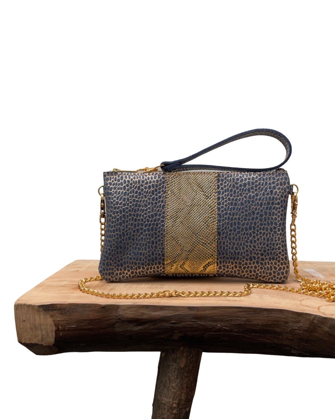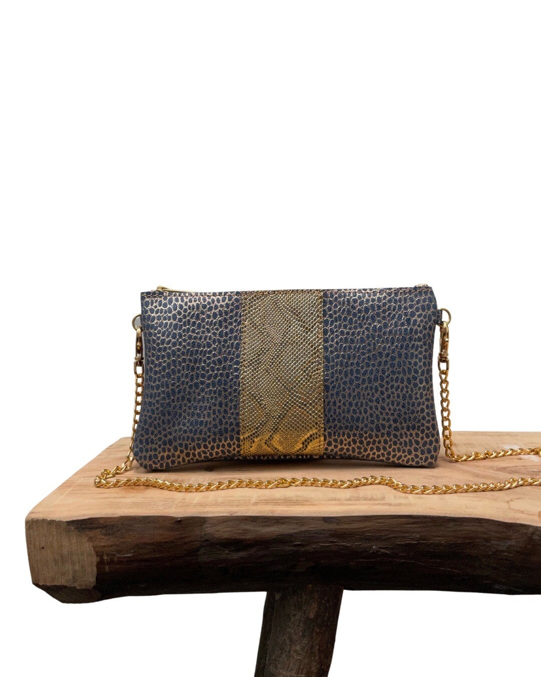 Hoe gaaf is deze prachtige donkerblauwe schoudertas en clutch in één. Deze schoudertas is voorzien van uniek donkerblauw leer met croco print en mooi goud leer op de voorzijde. Sluit doormiddel van een gouden rits aan de bovenzijde. Deze clutch is de finishing touch voor elk outfit!