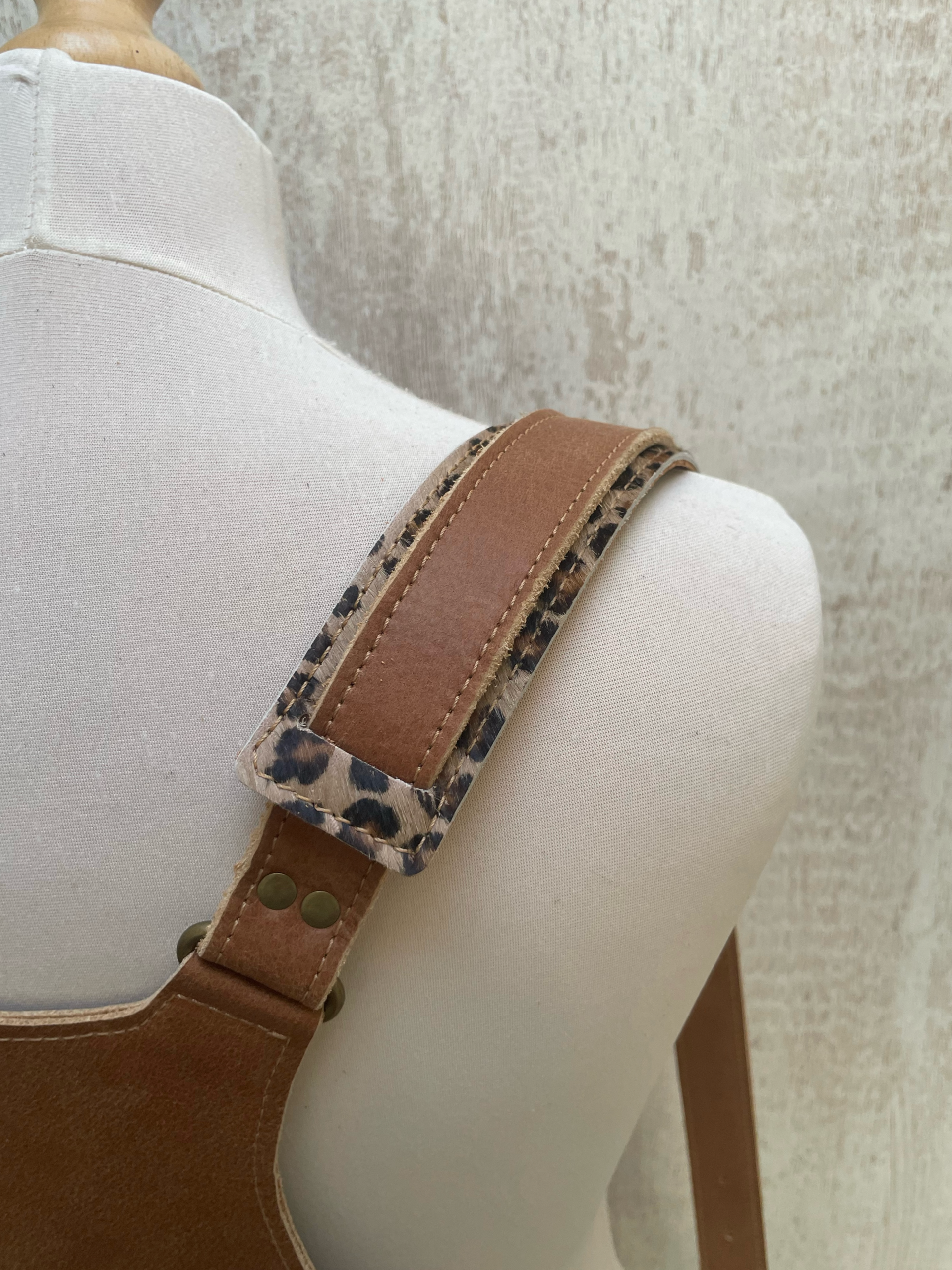 Hoe leuk is het om je camera harnas te voorzien van mooie leren schouderstukken. Deze stoere schouderbanden zijn gemaakt van uniek luipaardprint met aan de onderzijde cognac leer. Maak je harnas helemaal af in je eigen stijl.
